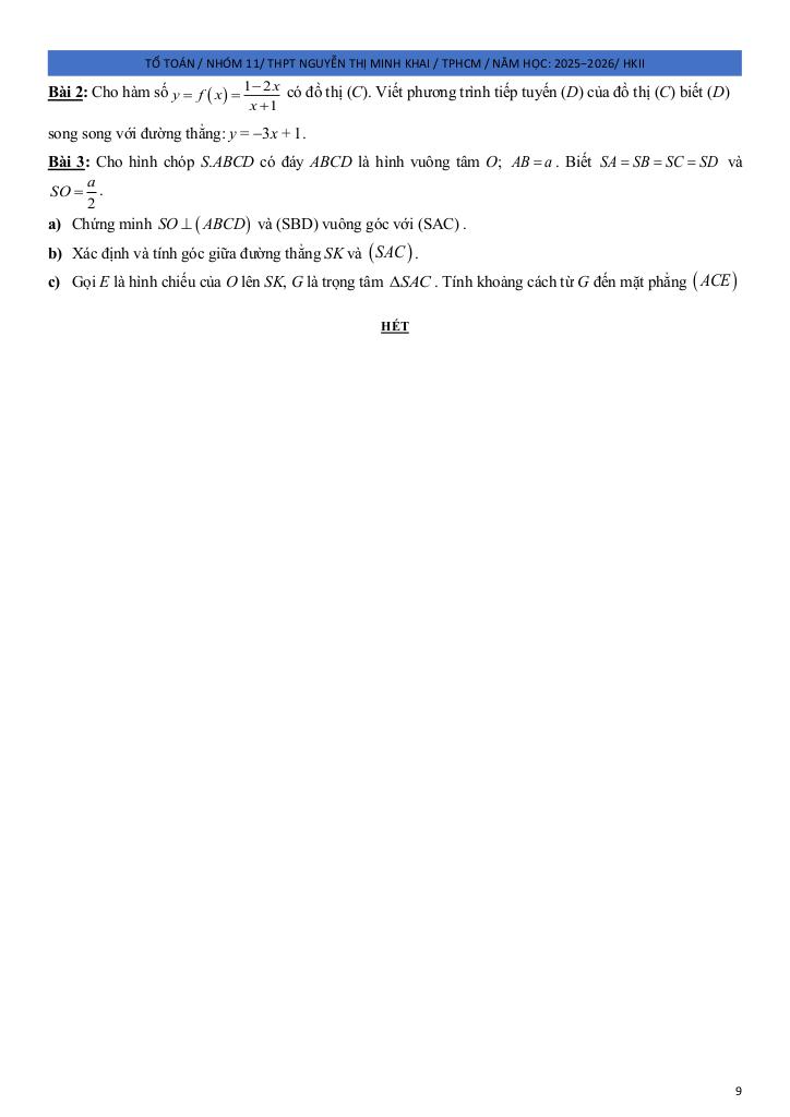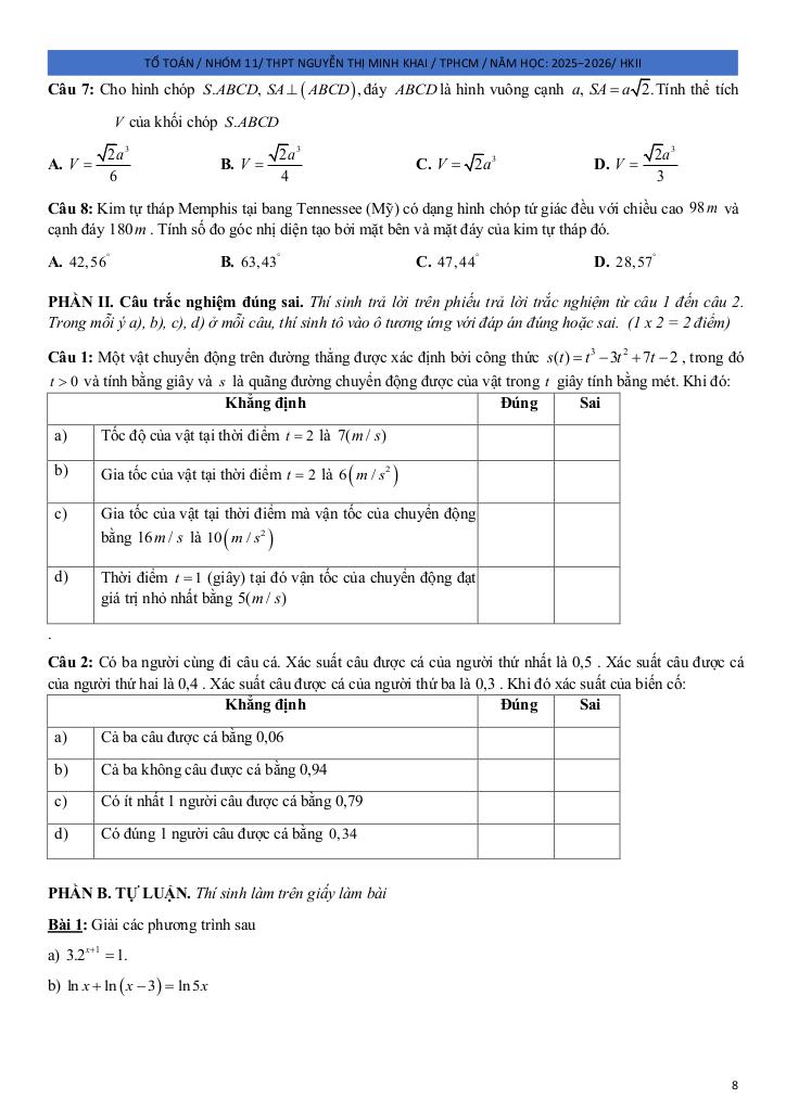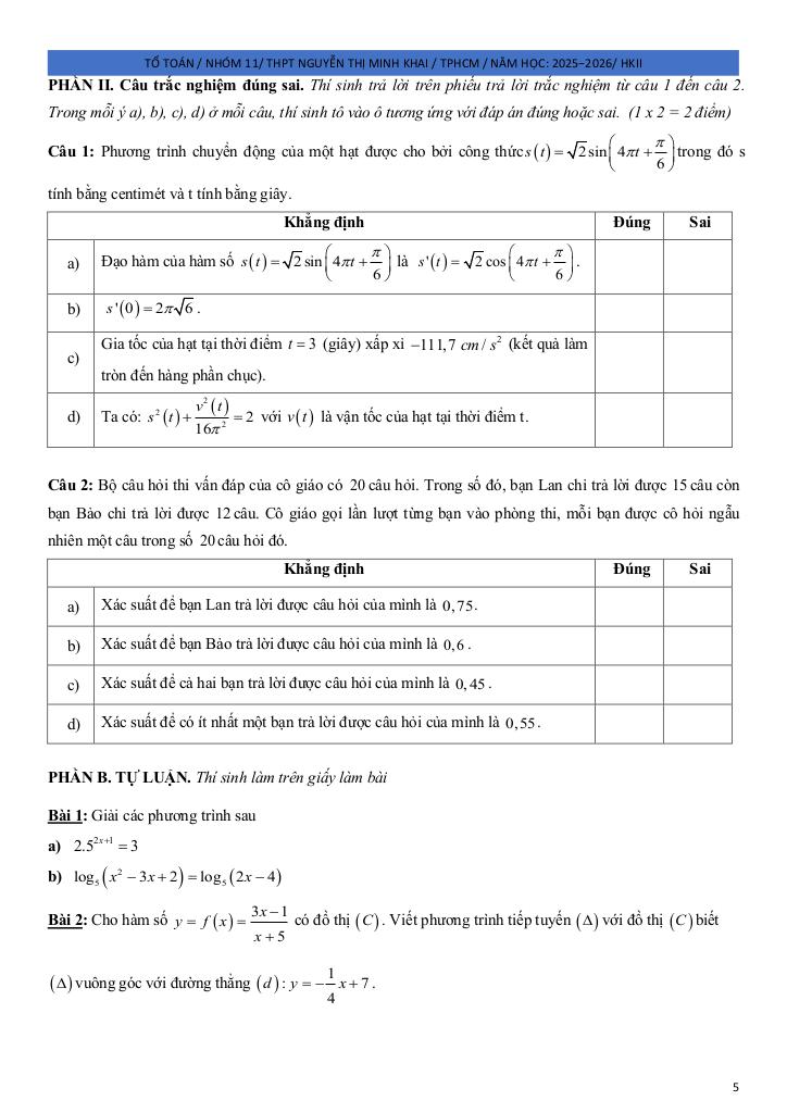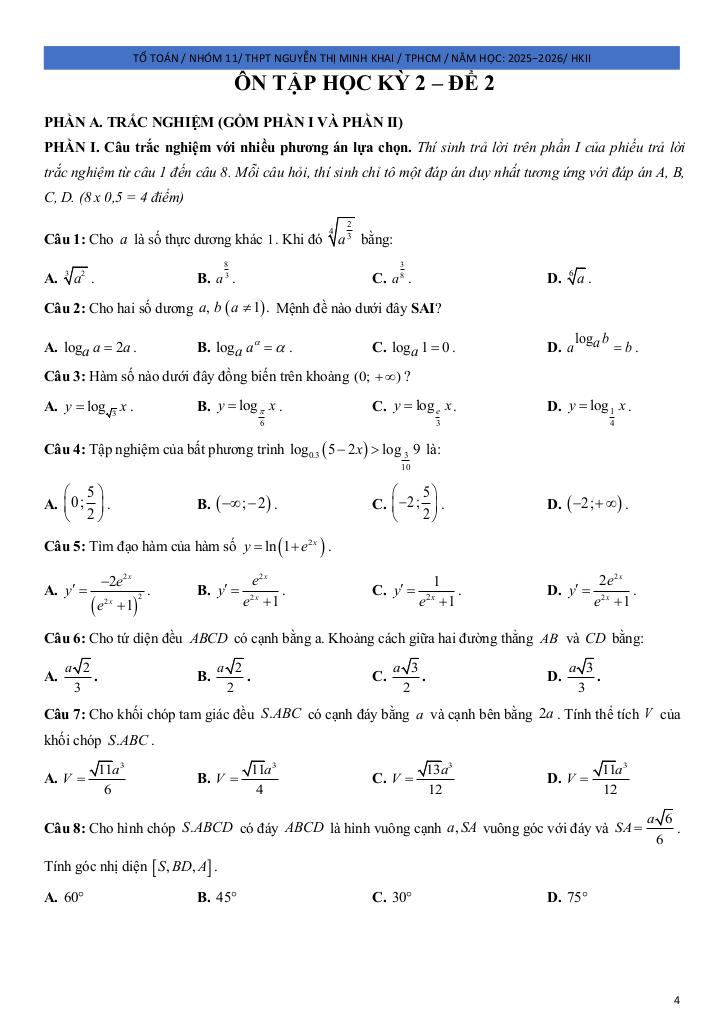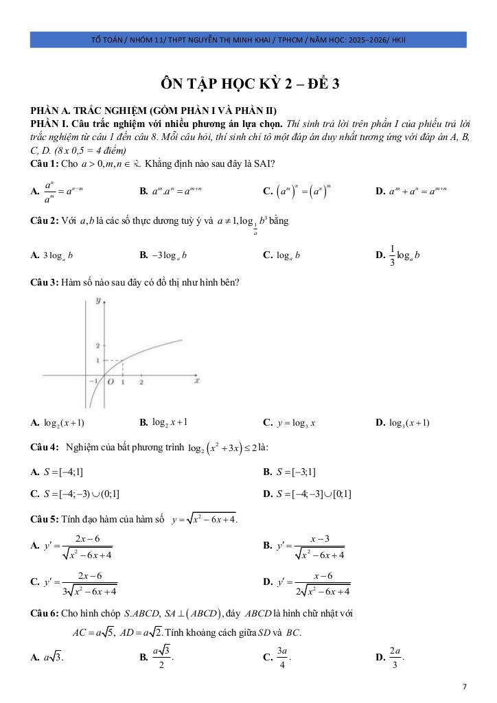 Giải Toán đề ôn tập hk2 toán 11 năm 2025 – 2026 trường thpt nguyễn thị minh khai – tp hcm với Đáp Án Mới Nhất