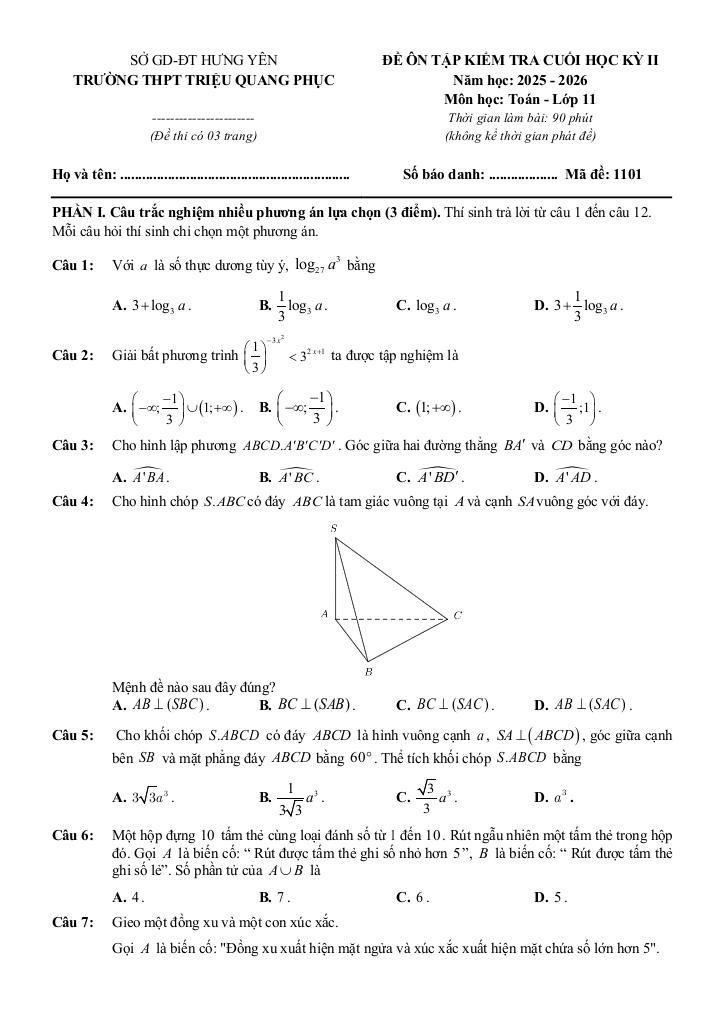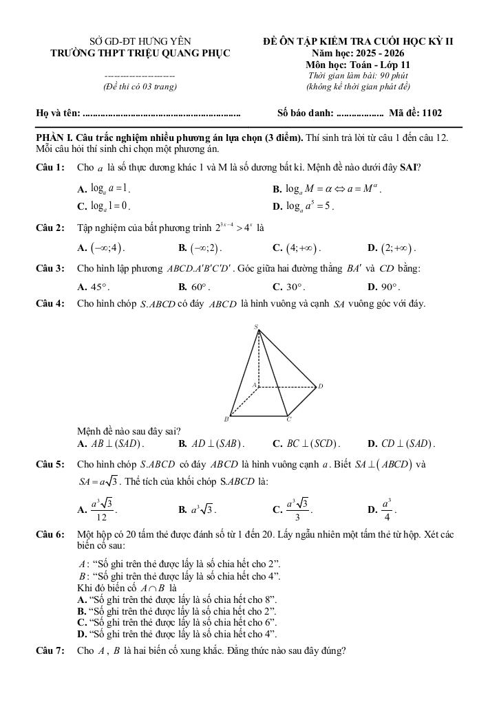 Giải Toán đề ôn tập hk2 toán 11 năm 2025 – 2026 trường thpt triệu quang phục – hưng yên với Đáp Án Mới Nhất
