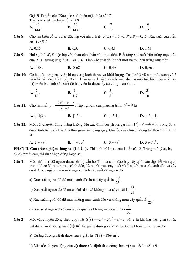 giaitoan.edu.vn giới thiệu đến quý thầy, cô giáo và các em học sinh đề ôn tập kiểm tra cuối học kỳ 2 môn Toán 11 năm học 2025 – 2026 trường THPT Triệu Quang Phục, tỉnh Hưng Yên. Đề thi gồm 12 câu trắc nghiệm nhiều phương án lựa chọn (3,0 điểm) + 02 câu trắc nghiệm đúng sai (2,0 điểm) + 04 câu trắc nghiệm trả lời ngắn (2,0 điểm) + 03 câu tự luận (3,0 điểm), thời gian làm bài 90 phút, có đáp án và lời giải chi tiết.