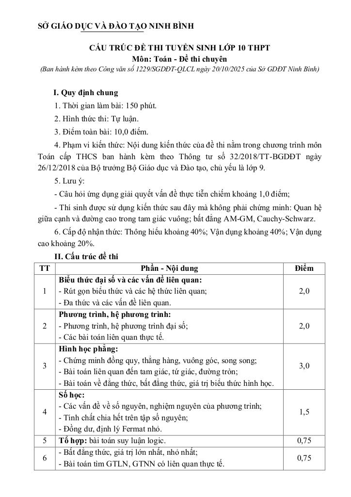 CẤU TRÚC ĐỀ THI TUYỂN SINH LỚP 10 THPT MÔN TOÁN – ĐỀ THI CHUYÊN (Ban hành kèm theo Công văn số 1229/SGDĐT-QLCL ngày 20/10/2025 của Sở GDĐT Ninh Bình):