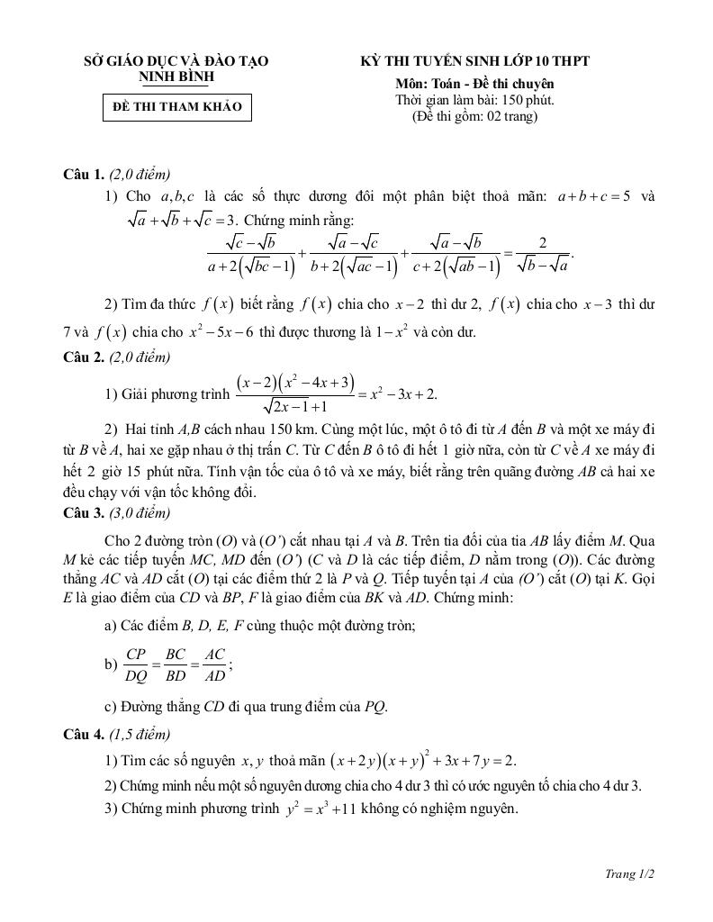 Giải Toán đề tham khảo tuyển sinh lớp 10 môn toán (chuyên) năm 2026 – 2027 sở gd&đt ninh bình với Đáp Án Mới Nhất