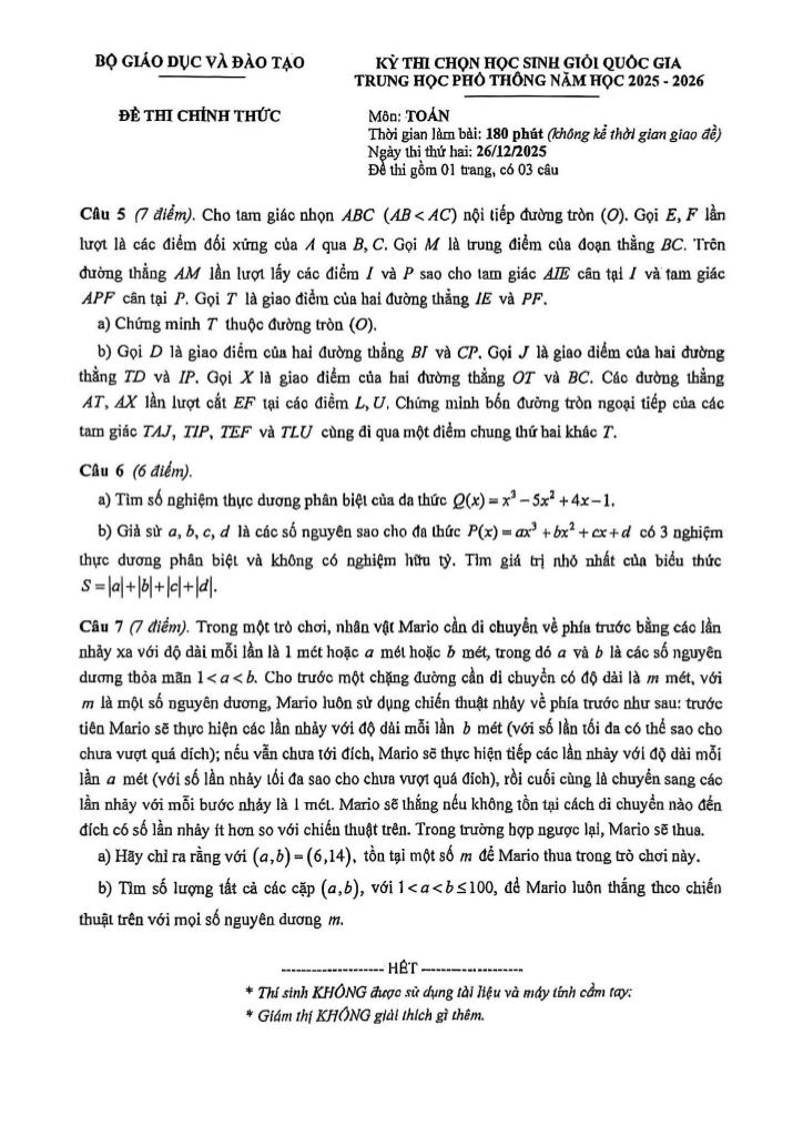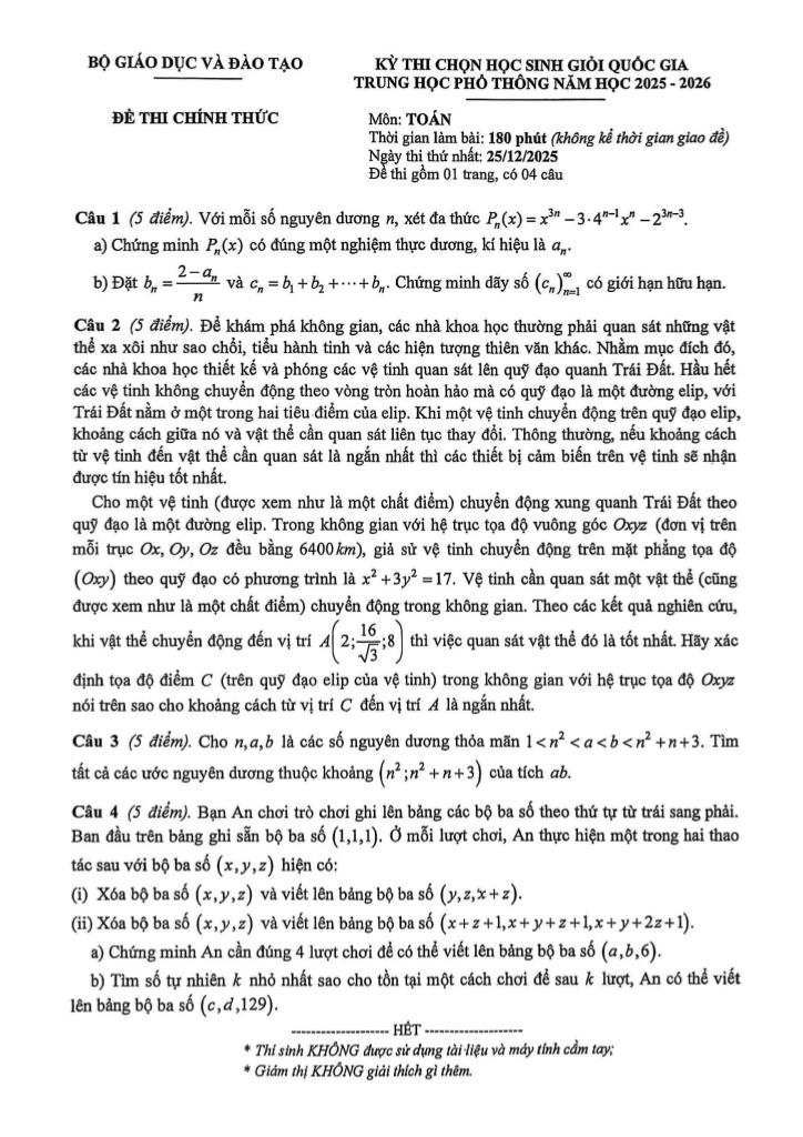 Trích dẫn Đề thi chọn học sinh giỏi Quốc gia môn Toán THPT năm học 2025 – 2026: