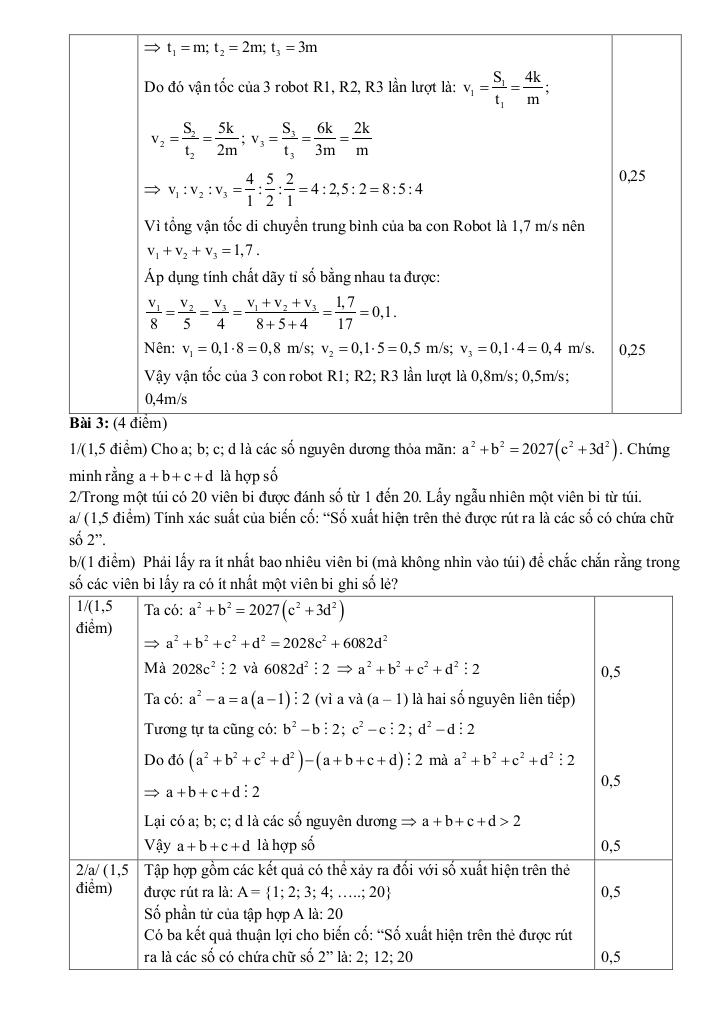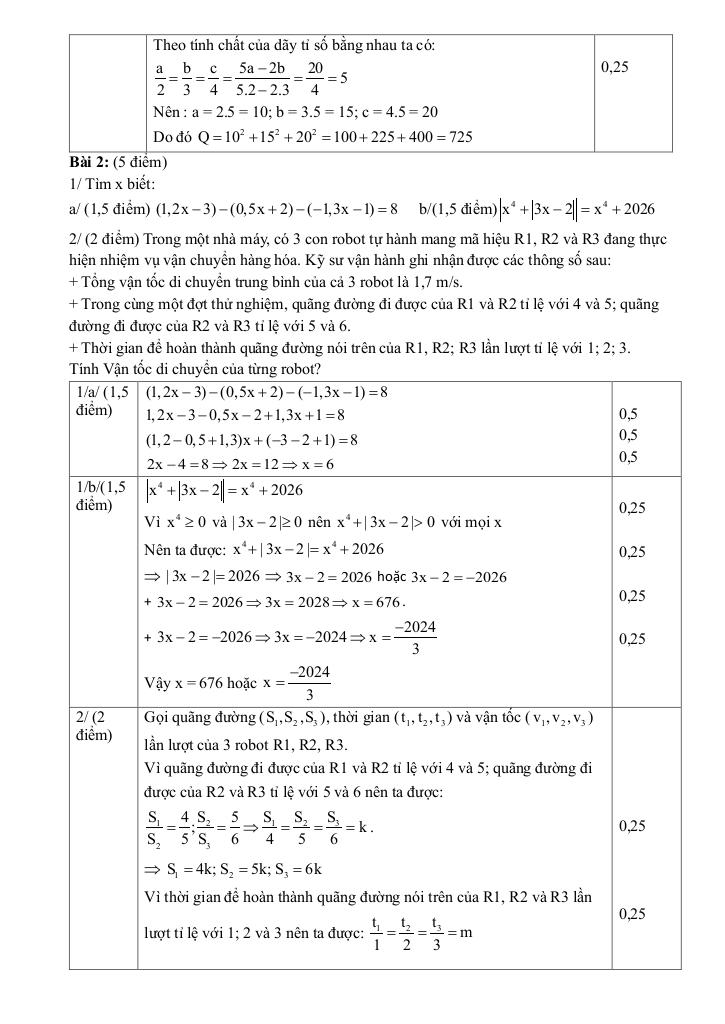 + Trong một nhà máy, có 3 con robot tự hành mang mã hiệu R1, R2 và R3 đang thực hiện nhiệm vụ vận chuyển hàng hóa. Kỹ sư vận hành ghi nhận được các thông số sau: – Tổng vận tốc di chuyển trung bình của cả 3 robot là 1,7 m/s. – Trong cùng một đợt thử nghiệm, quãng đường đi được của R1, R2 tỉ lệ với 4, 5; quãng đường đi được của R2, R3 tỉ lệ với 5, 6. – Thời gian để hoàn thành quãng đường nói trên của R1, R2, R3 lần lượt tỉ lệ với 1, 2, 3. Tính vận tốc di chuyển của từng robot?
