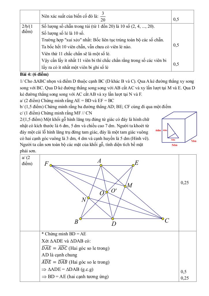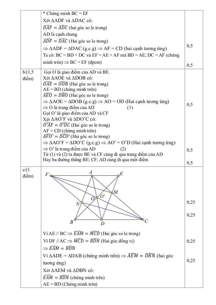 + Cho ∆ABC nhọn và điểm D thuộc cạnh BC (D khác B và C). Qua A kẻ đường thẳng xy song song với BC. Qua D kẻ đường thẳng song song với AB cắt AC và xy lần lượt tại M và E. Qua D kẻ đường thẳng song song với AC cắt AB và xy lần lượt tại N và F. a/ Chứng minh rằng AE = BD và EF = BC. b/ Chứng minh rằng ba đường thẳng AD; BE; CF cùng đi qua một điểm. c/ Chứng minh rằng MF // CN.
