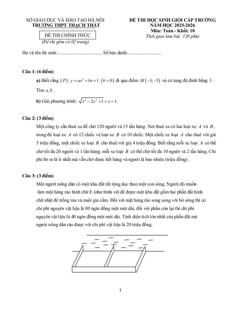 Giải Toán đề thi học sinh giỏi toán 10 năm 2025 – 2026 trường thpt thạch thất – hà nội với Đáp Án Mới Nhất