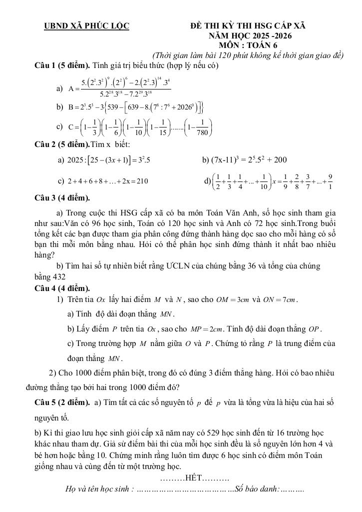 Trích dẫn Đề thi HSG cấp xã Toán 6 năm 2025 – 2026 xã Phúc Lộc – Nghệ An: