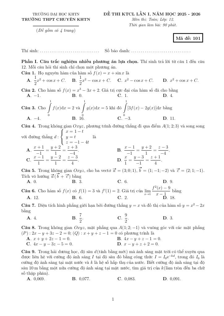 giaitoan.edu.vn giới thiệu đến quý thầy, cô giáo và các em học sinh đề thi kiểm tra chất lượng môn Toán 12 lần 1 năm học 2025 – 2026 trường THPT chuyên KHTN, Đại học KHTN, thành phố Hà Nội. Kỳ thi được diễn ra vào ngày 28 tháng 01 năm 2026. Đề thi có đáp án mã đề 101.