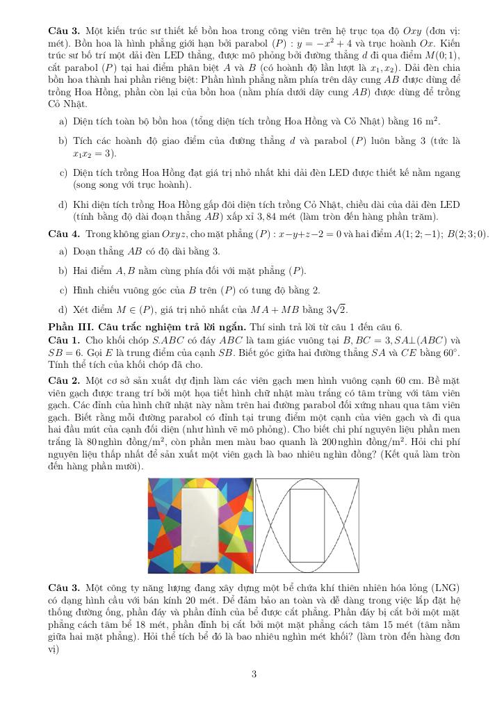 + Một cơ sở sản xuất dự định làm các viên gạch men hình vuông cạnh 60 cm. Bề mặt viên gạch được trang trí bởi một họa tiết hình chữ nhật màu trắng có tâm trùng với tâm viên gạch. Các đỉnh của hình chữ nhật này nằm trên hai đường parabol đối xứng nhau qua tâm viên gạch. Biết rằng mỗi đường parabol có đỉnh tại trung điểm một cạnh của viên gạch và đi qua hai đầu mút của cạnh đối diện (như hình vẽ mô phỏng). Cho biết chi phí nguyên liệu phần men trắng là 80 nghìn đồng/m2, còn phần men màu bao quanh là 200 nghìn đồng/m2. Hỏi chi phí nguyên liệu thấp nhất để sản xuất một viên gạch là bao nhiêu nghìn đồng? (Kết quả làm tròn đến hàng phần mười).