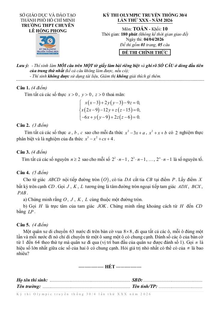 Trích dẫn Đề thi Olympic 30 tháng 04 năm 2026 Toán 10 trường chuyên Lê Hồng Phong – TP HCM: