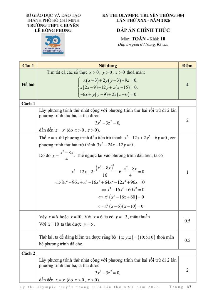 Giải Toán đề thi olympic 30 tháng 04 năm 2026 toán 10 trường chuyên lê hồng phong – tp hcm với Đáp Án Mới Nhất