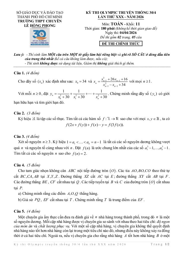 Trích dẫn Đề thi Olympic 30 tháng 04 năm 2026 Toán 11 trường chuyên Lê Hồng Phong – TP HCM: