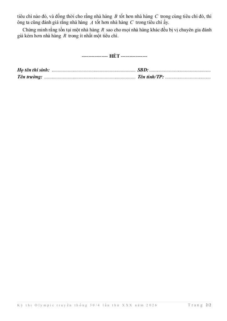 + Một chuyên gia ẩm thực cần đưa ra đánh giá về n nhà hàng trong thành phố, trong đó n là một số nguyên dương. Mỗi cặp nhà hàng được vị chuyên gia so sánh với nhau theo hai tiêu chí: độ ngon của món ăn và chất lượng phục vụ. Với một số cặp nhà hàng, vị chuyên gia không thể quyết định nhà hàng nào tốt hơn nhà hàng còn lại trong một tiêu chí nào đó, nhưng điều này không xảy ra đồng thời ở cả hai tiêu chí. Ngoài ra, nếu vị chuyên gia cho rằng nhà hàng A tốt hơn nhà hàng B ở một tiêu chí nào đó, và đồng thời cho rằng nhà hàng B tốt hơn nhà hàng C trong cùng tiêu chí đó, thì ông ta cũng đánh giá rằng nhà hàng A tốt hơn nhà hàng C trong tiêu chí ấy. Chứng minh rằng tồn tại một nhà hàng R sao cho mọi nhà hàng khác đều bị vị chuyên gia đánh giá kém hơn nhà hàng R trong ít nhất một tiêu chí.