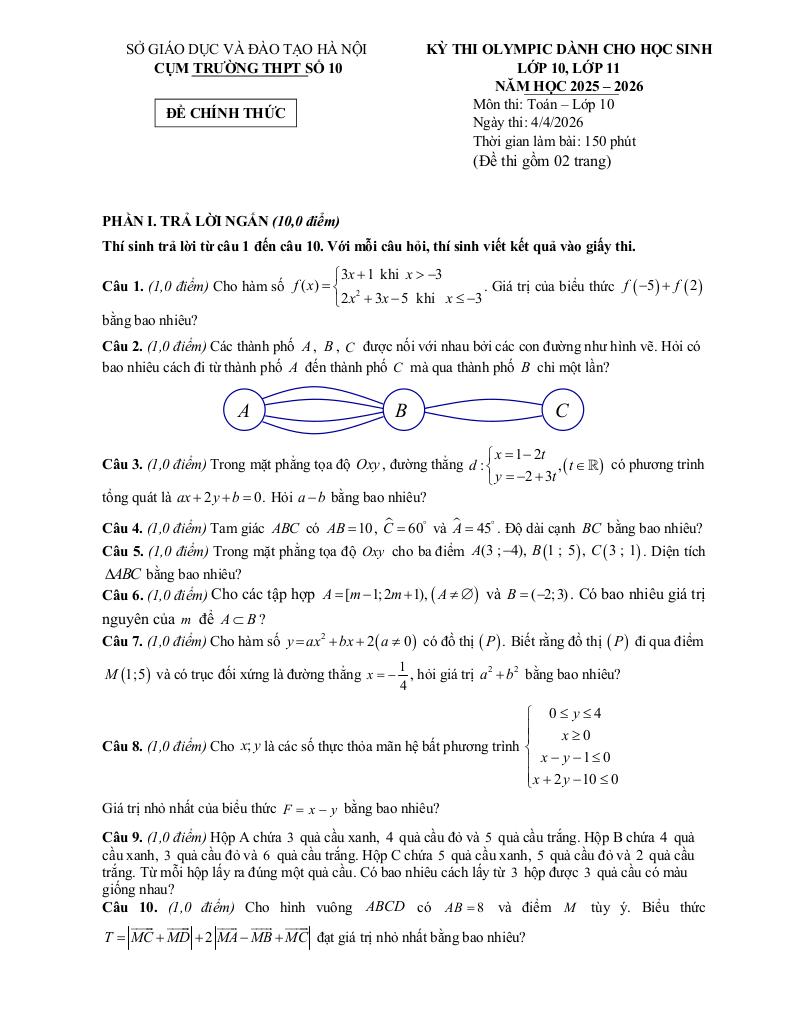 giaitoan.edu.vn giới thiệu đến quý thầy, cô giáo và các em học sinh đề thi Olympic dành cho học sinh môn Toán 10 năm học 2025 – 2026 cụm trường THPT số 10, thành phố Hà Nội. Kỳ thi được diễn ra vào ngày 04 tháng 04 năm 2026. Đề thi có đáp án và hướng dẫn chấm điểm.