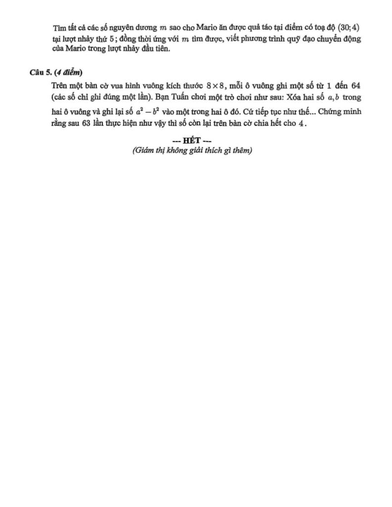 + Trên một bàn cờ vua hình vuông kích thước 8 × 8, mỗi ô vuông ghi một số từ 1 đến 64 (các số chỉ ghi đúng một lần). Bạn Tuấn chơi một trò chơi như sau: Xóa hai số a, b trong hai ô vuông và ghi lại số a2 – b2 vào một trong hai ô đó. Cứ tiếp tục như thế …. Chứng minh rằng sau 63 lần thực hiện như vậy thì số còn lại trên bàn cờ chia hết cho 4.