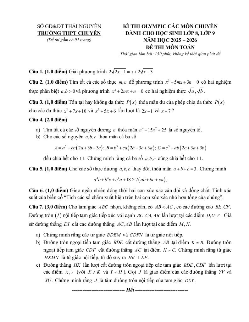 Giải Toán đề thi olympic toán thcs năm 2025 – 2026 trường thpt chuyên thái nguyên với Đáp Án Mới Nhất