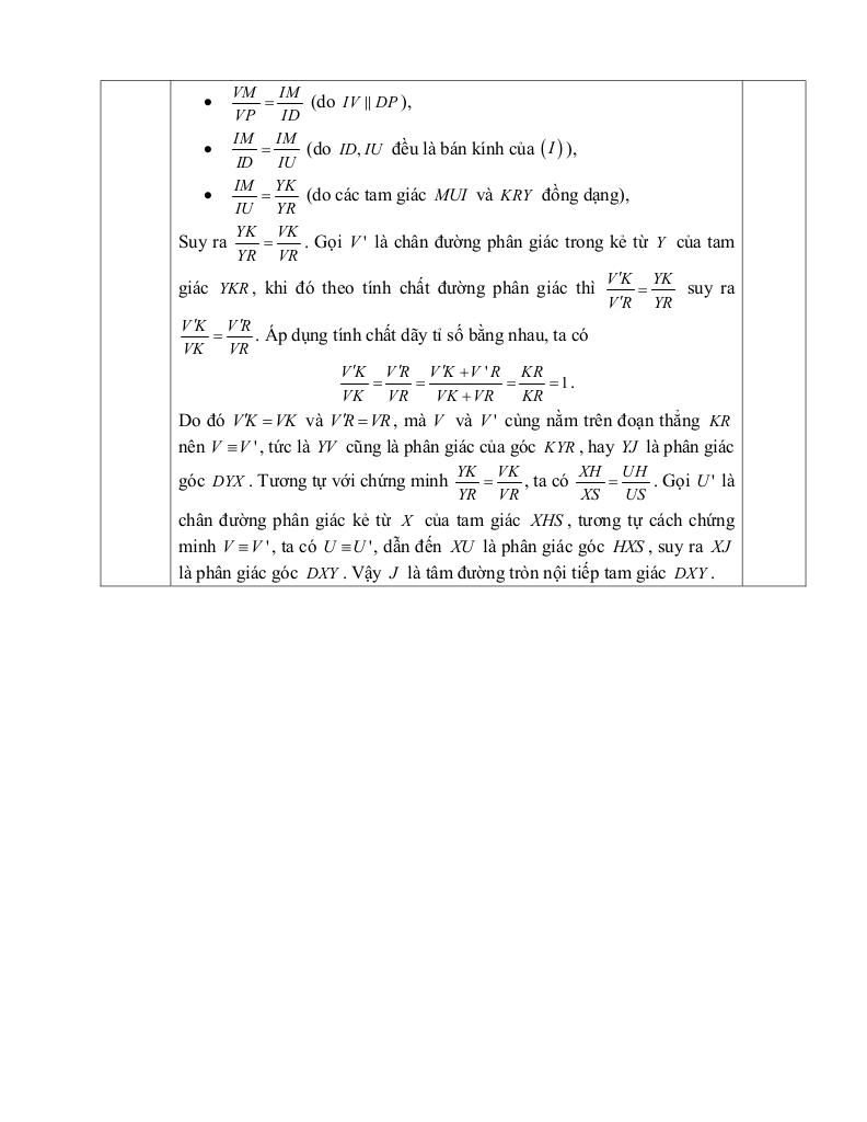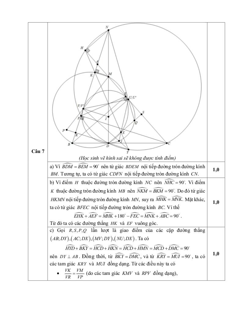 + Cho tam giác ABC nhọn, không cân, có AB, AC có các đường cao BE, CF. Đường tròn (I) nội tiếp tam giác tiếp xúc với cạnh BC, CA, AB lần lượt tại các điểm D, U, V. Giả sử đường thẳng DI cắt các đường thẳng AC, AB lần lượt tại các điểm M, N. a) Chứng minh rằng các tứ giác BDEM và CDFN là tứ giác nội tiếp. b) Đường tròn ngoại tiếp tam giác BDE cắt đường thẳng AB tại điểm K ≠ B. Đường tròn ngoại tiếp tam giác CDF cắt đường thẳng AC tại điểm H ≠ C. Chứng minh rằng tứ giác HKMN là tứ giác nội tiếp, từ đó suy ra HK vuông góc EF. c) Đường thẳng HK lần lượt cắt đường tròn ngoại tiếp các tam giác BDE, CDF lần lượt tại các điểm X, Y (với X ≠ K và Y ≠ H). Gọi J là giao điểm của các đường thẳng YV và XU. Chứng minh rằng J là tâm đường tròn nội tiếp của tam giác DXY.