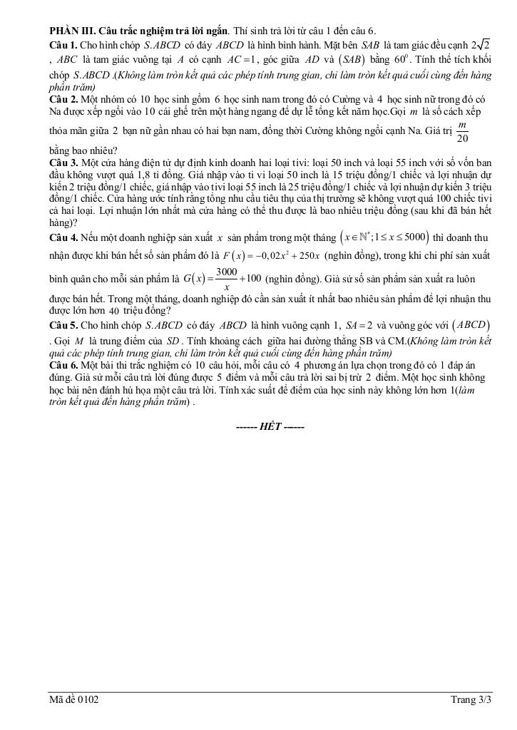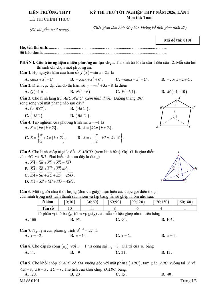 giaitoan.edu.vn giới thiệu đến quý thầy, cô giáo và các em học sinh đề thi thử tốt nghiệp THPT năm 2026 lần 1 môn Toán liên trường THPT: THPT Cù Huy Cận – THPT Đức Thọ – THPT Vũ Quang, tỉnh Hà Tĩnh. Đề thi gồm 12 câu trắc nghiệm nhiều phương án lựa chọn (3,0 điểm) + 04 câu trắc nghiệm đúng sai (4,0 điểm) + 06 câu trắc nghiệm trả lời ngắn (3,0 điểm), thời gian làm bài 90 phút, có đáp án và lời giải chi tiết mã đề 0101 – 0102 – 0103 – 0104.