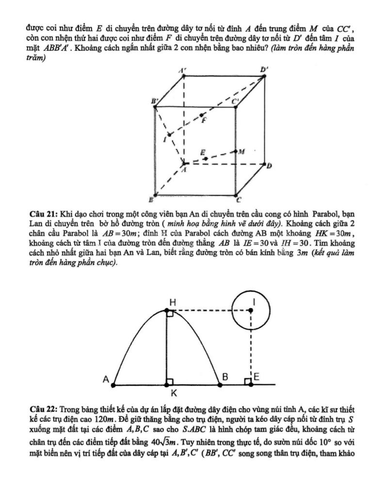 + Trong căn phòng hình hộp chữ nhật, sàn nhà là hình vuông cạnh bằng 5m, chiều cao của phòng là 6m, có hai con nhện đang di chuyển trên 2 dây tơ khác nhau. Giả sử căn phòng được mô hình hóa là hình hộp chữ nhật ABCD.A’B’C’D’ với ABCD là nền phòng thì con nhện thứ nhất được coi như điểm E di chuyển trên đường dây tơ nối từ đỉnh A đến trung điểm M của CС’, còn con nhện thứ hai được coi như điểm F di chuyển trên đường dây tơ nối từ D’ đến tâm I của mặt ABB’A’. Khoảng cách ngắn nhất giữa 2 con nhện bằng bao nhiêu? (làm tròn đến hàng phần trăm).