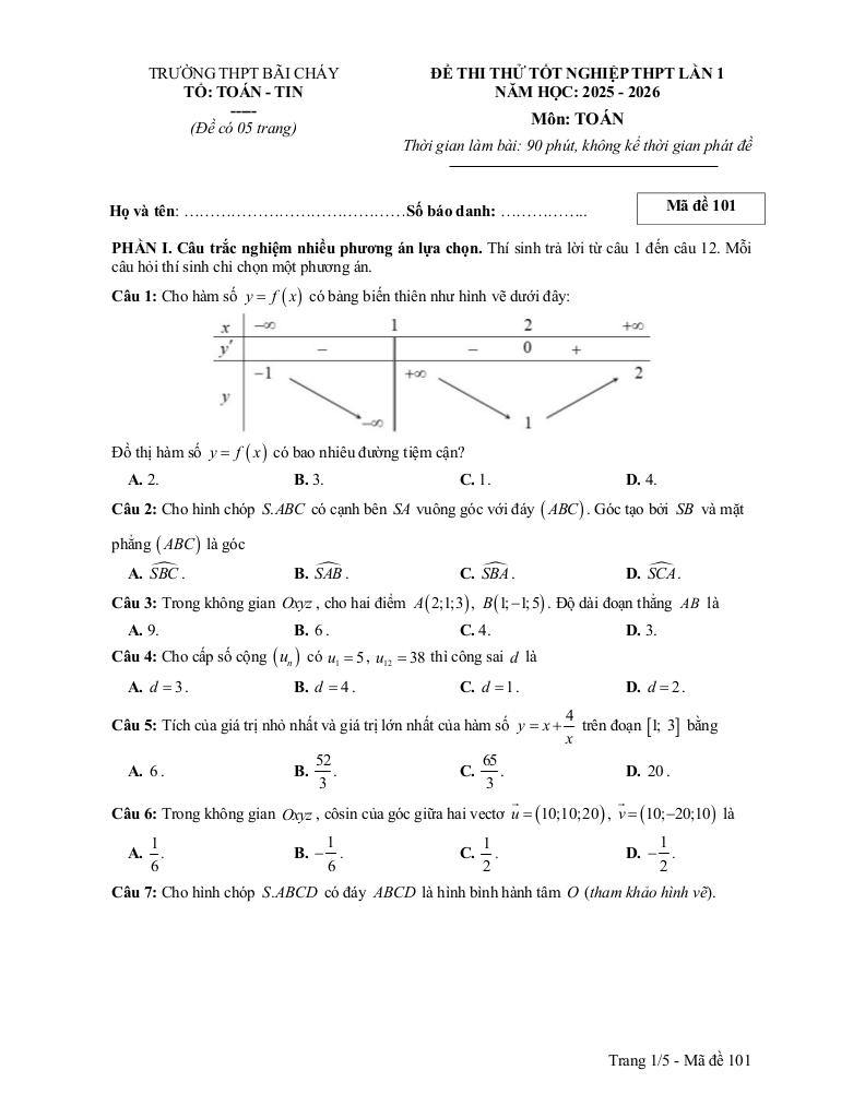giaitoan.edu.vn giới thiệu đến quý thầy, cô giáo và các em học sinh đề thi thử tốt nghiệp THPT năm học 2025 – 2026 lần 1 môn Toán trường THPT Bãi Cháy, tỉnh Quảng Ninh. Kỳ thi được diễn ra vào tháng 12 năm 2025.
