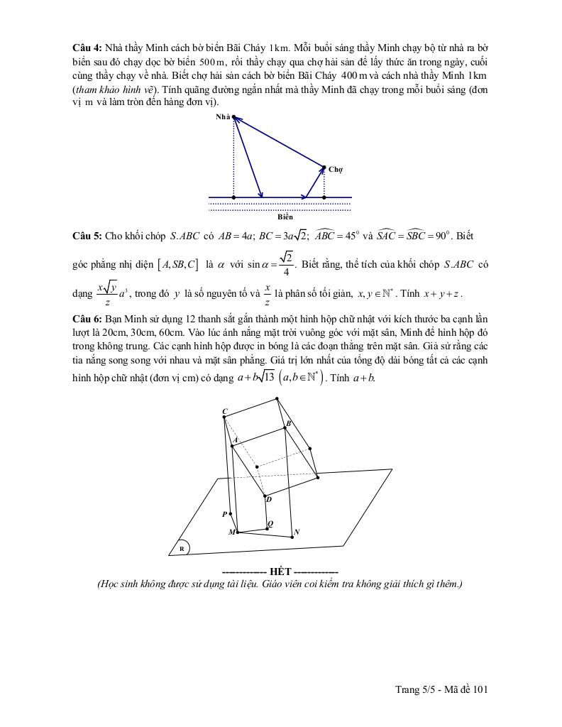 + Nhà thầy Minh cách bờ biển Bãi Cháy 1km. Mỗi buổi sáng thầy Minh chạy bộ từ nhà ra bờ biển sau đó chạy dọc bờ biển 500 m, rồi thầy chạy qua chợ hải sản để lấy thức ăn trong ngày, cuối cùng thầy chạy về nhà. Biết chợ hải sản cách bờ biển Bãi Cháy 400 m và cách nhà thầy Minh 1km (tham khảo hình vẽ). Tính quãng đường ngắn nhất mà thầy Minh đã chạy trong mỗi buổi sáng (đơn vị m và làm tròn đến hàng đơn vị).