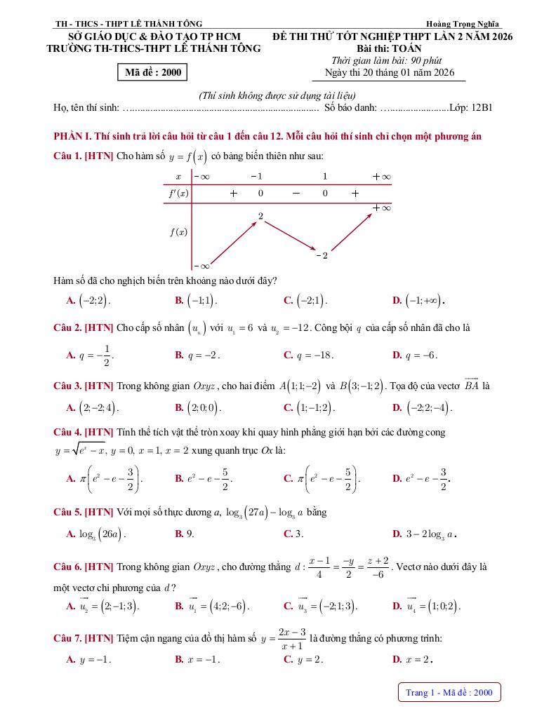 giaitoan.edu.vn giới thiệu đến quý thầy, cô giáo và các em học sinh đề thi thử tốt nghiệp THPT năm học 2025 – 2026 lần 2 môn Toán trường TH – THCS – THPT Lê Thánh Tông, thành phố Hồ Chí Minh. Kỳ thi được diễn ra vào ngày 20 tháng 01 năm 2026. Đề thi có đáp án mã đề 2000.
