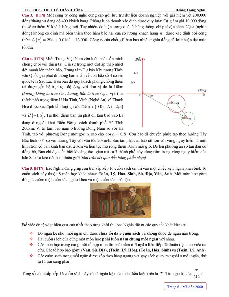 + Miền Trung Việt Nam vốn luôn phải oằn mình chống chọi với thiên tai. Giả sử trong một đợt áp thấp nhiệt đới mạnh lên thành bão, Trung tâm Dự báo Khí tượng Thủy văn Quốc gia phát đi thông báo khẩn về cơn bão số 4 có tên quốc tế là Sao La. Trên bản đồ quy hoạch phòng chống thiên tai được gắn hệ trục tọa độ Oxy với đơn vị đo là 10km (hướng Đông là trục Ox, hướng Bắc là trục Oy), vị trí ba thành phố trọng điểm là Hà Tĩnh, Vinh (Nghệ An) và Thanh Hóa được xác định lần lượt tại các điểm T(0;0), N(-2;3) và H(-1;5). Tại thời điểm bản tin phát đi, tâm bão Sao La đang ở ngoài khơi Biển Đông, cách thành phố Hà Tĩnh 200km. Vị trí tâm bão nằm ở hướng Đông Nam so với Hà Tĩnh, tạo với phương Đông một góc a sao cho cos a = 0,8. Cơn bão di chuyển phức tạp theo hướng Tây Bắc lệch 60 so với hướng Tây với vận tốc 20km/h. Sức tàn phá của bão rất lớn với vùng nguy hiểm là một hình tròn có bán kính ban đầu 20km và liên tục mở rộng thêm 10km mỗi giờ. Để lên phương án sơ tán dân cư đồng bộ, Ban chỉ đạo cần biết khoảng thời gian mà cả 3 thành phố này cùng nằm trong vùng nguy hiểm của bão Sao La kéo dài bao nhiêu giờ? (làm tròn kết quả đến hàng phần chục).