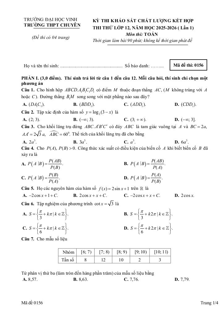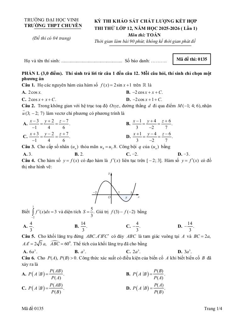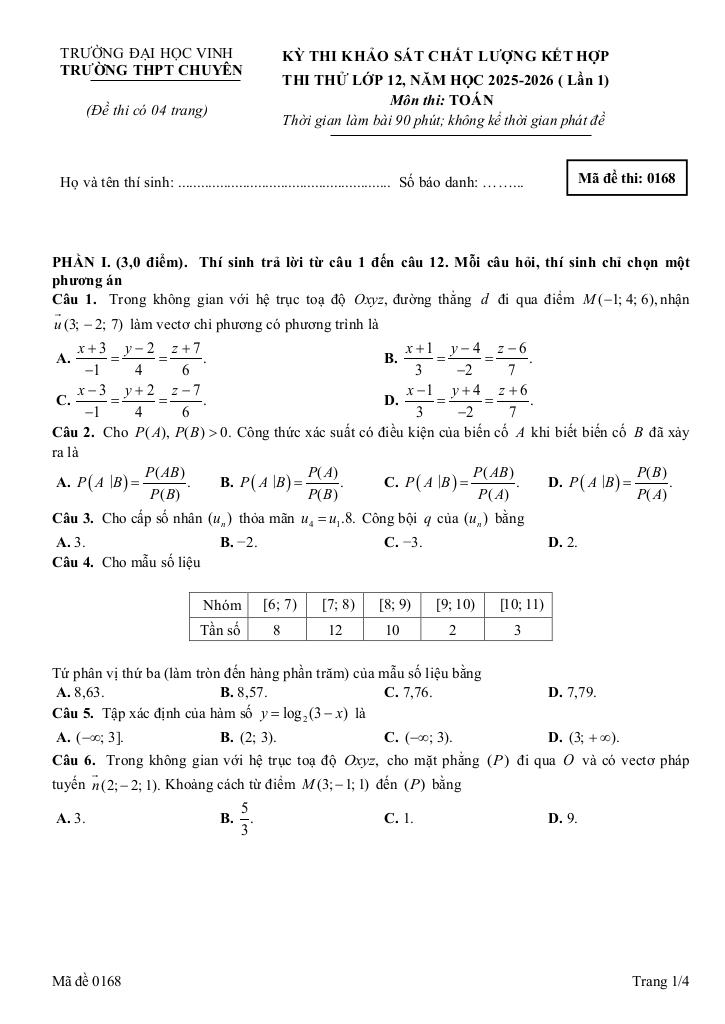 Trích dẫn Đề thi thử TN THPT 2026 môn Toán lần 1 trường chuyên ĐH Vinh – Nghệ An: