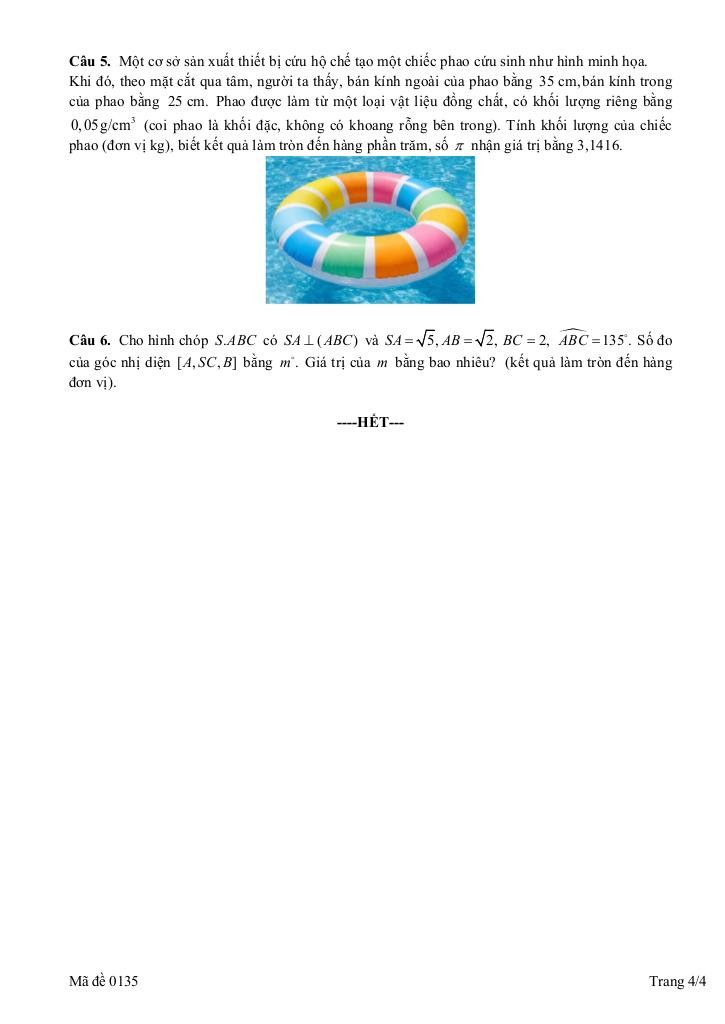 + Một cơ sở sản xuất thiết bị cứu hộ chế tạo một chiếc phao cứu sinh như hình minh họa. Khi đó, theo mặt cắt qua tâm, người ta thấy, bán kính ngoài của phao bằng 35 cm,bán kính trong của phao bằng 25 cm. Phao được làm từ một loại vật liệu đồng chất, có khối lượng riêng bằng 0,05g/cm3 (coi phao là khối đặc, không có khoang rỗng bên trong). Tính khối lượng của chiếc phao (đơn vị kg), biết kết quả làm tròn đến hàng phần trăm, số π nhận giá trị bằng 3,1416.