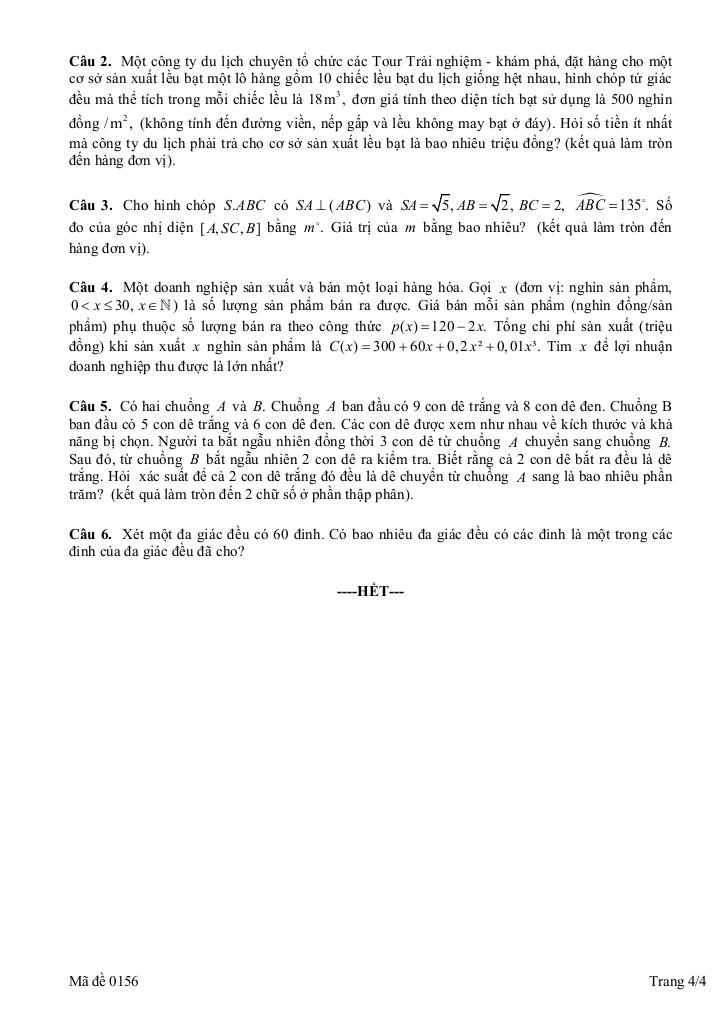 + Một công ty du lịch chuyên tổ chức các Tour Trải nghiệm – khám phá, đặt hàng cho một cơ sở sản xuất lều bạt một lô hàng gồm 10 chiếc lều bạt du lịch giống hệt nhau, hình chóp tứ giác đều mà thể tích trong mỗi chiếc lều là 18m3, đơn giá tính theo diện tích bạt sử dụng là 500 nghìn đồng / m2, (không tính đến đường viền, nếp gấp và lều không may bạt ở đáy). Hỏi số tiền ít nhất mà công ty du lịch phải trả cho cơ sở sản xuất lều bạt là bao nhiêu triệu đồng? (kết quả làm tròn đến hàng đơn vị).