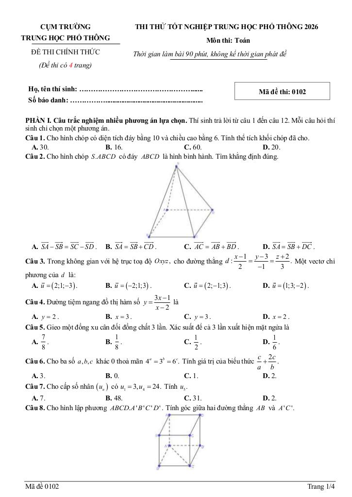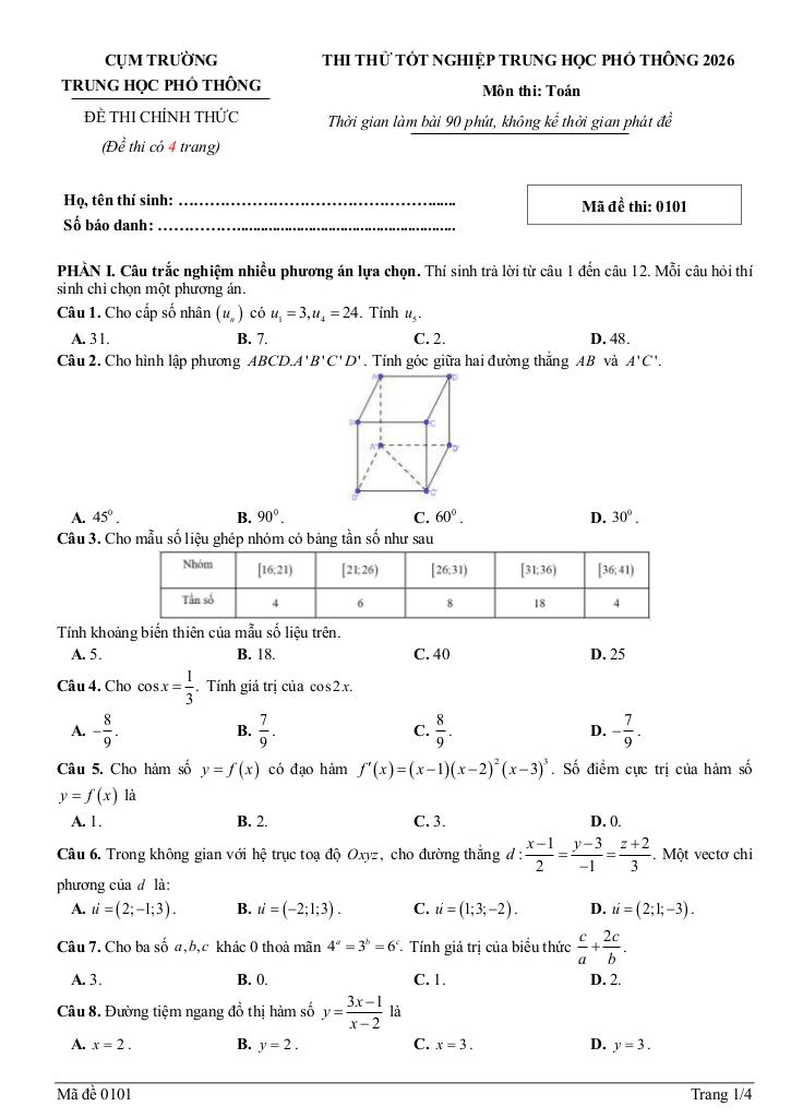 Xem thêm đáp án: đề thi thử tn thpt 2026 môn toán lần 2 trường chuyên phan bội châu – nghệ an