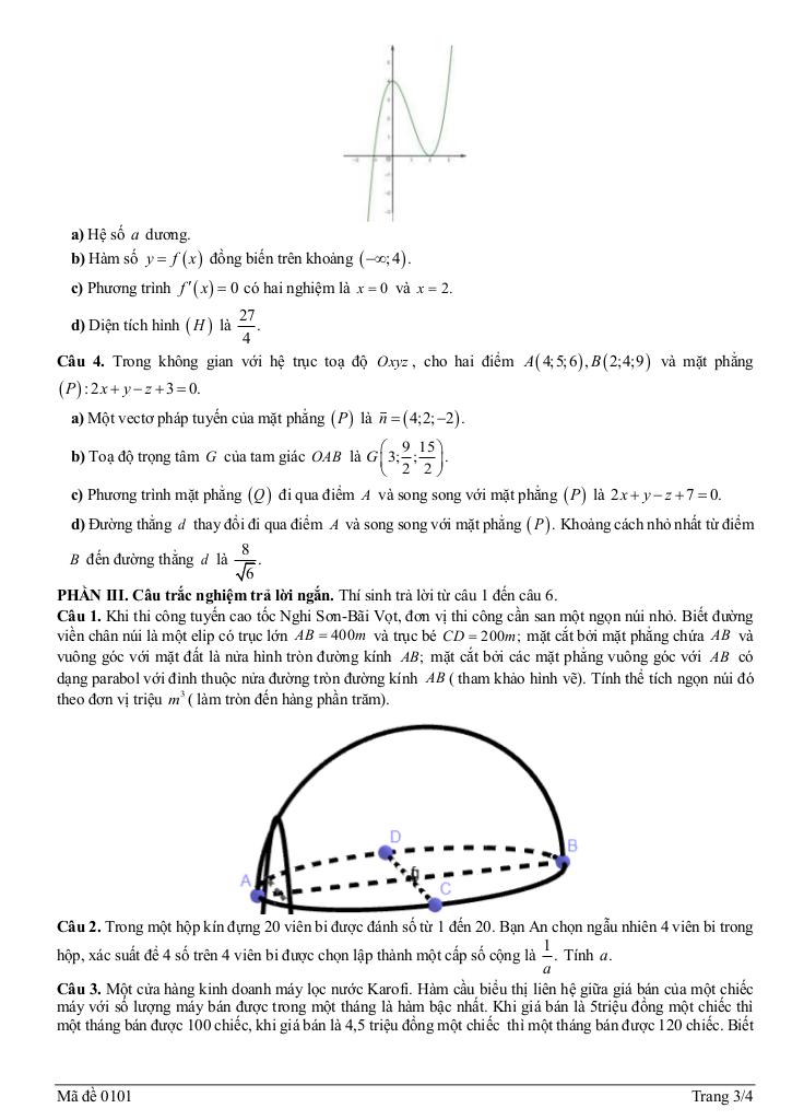 + Khi thi công tuyến cao tốc Nghi Sơn – Bãi Vọt, đơn vị thi công cần san một ngọn núi nhỏ. Biết đường viền chân núi là một elip có trục lớn AB = 400m và trục bé CD = 200m; mặt cắt bởi mặt phẳng chứa AB và vuông góc với mặt đất là nửa hình tròn đường kính AB; mặt cắt bởi các mặt phẳng vuông góc với AB có dạng parabol với đỉnh thuộc nửa đường tròn đường kính AB (tham khảo hình vẽ). Tính thể tích ngọn núi đó theo đơn vị triệu m3 (làm tròn đến hàng phần trăm).
