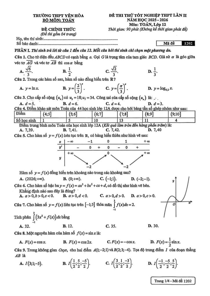 Trích dẫn Đề thi thử TN THPT 2026 môn Toán lần 2 trường THPT Yên Hòa – Hà Nội: