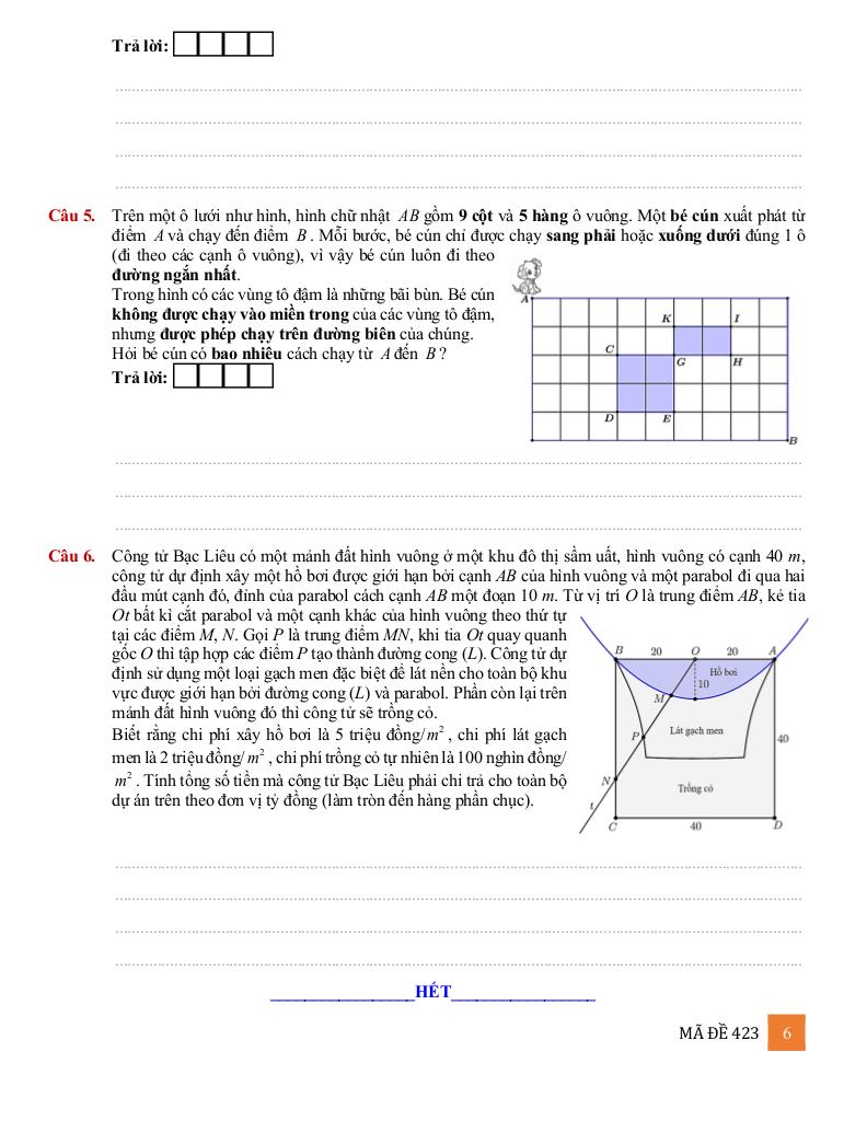 + Công tử Bạc Liêu có một mảnh đất hình vuông ở một khu đô thị sầm uất, hình vuông có cạnh 40 m, công tử dự định xây một hồ bơi được giới hạn bởi cạnh AB của hình vuông và một parabol đi qua hai đầu mút cạnh đó, đỉnh của parabol cách cạnh AB một đoạn 10 m. Từ vị trí O là trung điểm AB, kẻ tia Ot bất kì cắt parabol và một cạnh khác của hình vuông theo thứ tự tại các điểm M, N. Gọi P là trung điểm MN, khi tia Ot quay quanh gốc O thì tập hợp các điểm P tạo thành đường cong (L). Công tử dự định sử dụng một loại gạch men đặc biệt để lát nền cho toàn bộ khu vực được giới hạn bởi đường cong (L) và parabol. Phần còn lại trên mảnh đất hình vuông đó thì công tử sẽ trồng cỏ. Biết rằng chi phí xây hồ bơi là 5 triệu đồng/m2, chi phí lát gạch men là 2 triệu đồng/m2, chi phí trồng cỏ tự nhiên là 100 nghìn đồng/m2. Tính tổng số tiền mà công tử Bạc Liêu phải chi trả cho toàn bộ dự án trên theo đơn vị tỷ đồng (làm tròn đến hàng phần chục).