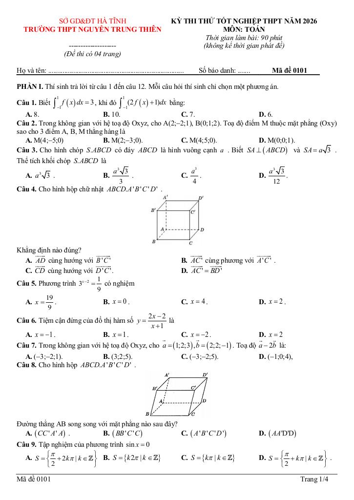 Toán học luôn là một môn học quan trọng, giúp học sinh phát triển tư duy logic và kỹ năng giải quyết vấn đề. Để hỗ trợ các bạn học sinh và giáo viên trong việc học tập và giảng dạy, bài viết này sẽ cung cấp lời giải chi tiết và đáp án chính xác cho chủ đề đề thi thử tn thpt 2026 môn toán trường thpt nguyễn trung thiên – hà tĩnh, giúp bạn hiểu sâu và tự tin hơn khi làm bài tập.