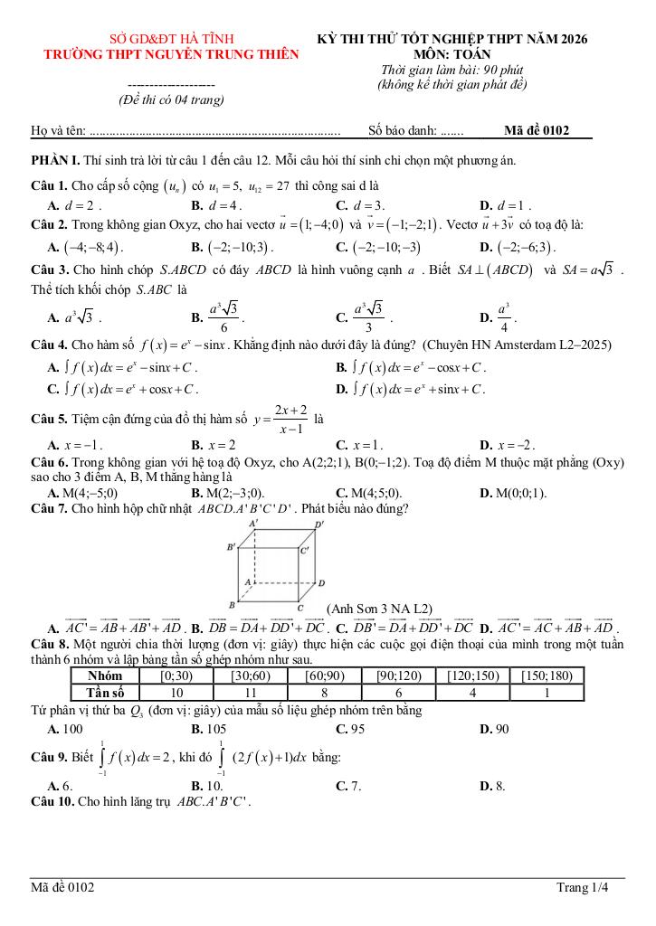 Trích dẫn Đề thi thử TN THPT 2026 môn Toán trường THPT Nguyễn Trung Thiên – Hà Tĩnh: