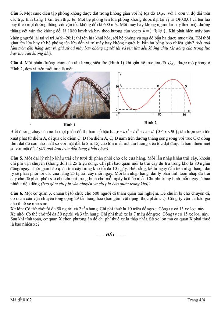 + Một cuộc diễn tập phòng không được đặt trong không gian với hệ tọa độ Oxyz với 1 đơn vị độ dài trên các trục tính bằng 1 km trên thực tế. Một bệ phóng tên lửa phòng không được đặt tại vị trí O(0;0;0) và tên lửa bay theo một đường thẳng với vận tốc không đổi là 600 m/s. Một máy bay không người lái bay theo một đường thẳng với vận tốc không đổi là 1080 km/h và bay theo hướng của vectơ u = (-3;4;0). Khi phát hiện máy bay không người lái tại vị trí A(6;−20;1) thì tên lửa khai hỏa, rời bệ phóng và sau đó bắn hạ được mục tiêu. Hỏi khoảng cách từ bệ phóng tên lửa đến vị trí máy bay không người bị bắn hạ bằng bao nhiêu km? (kết quả làm tròn đến hàng phần chục, giả sử cả máy bay không người lái và tên lửa đều không chịu tác động của trọng lực hay lực cản không khí).