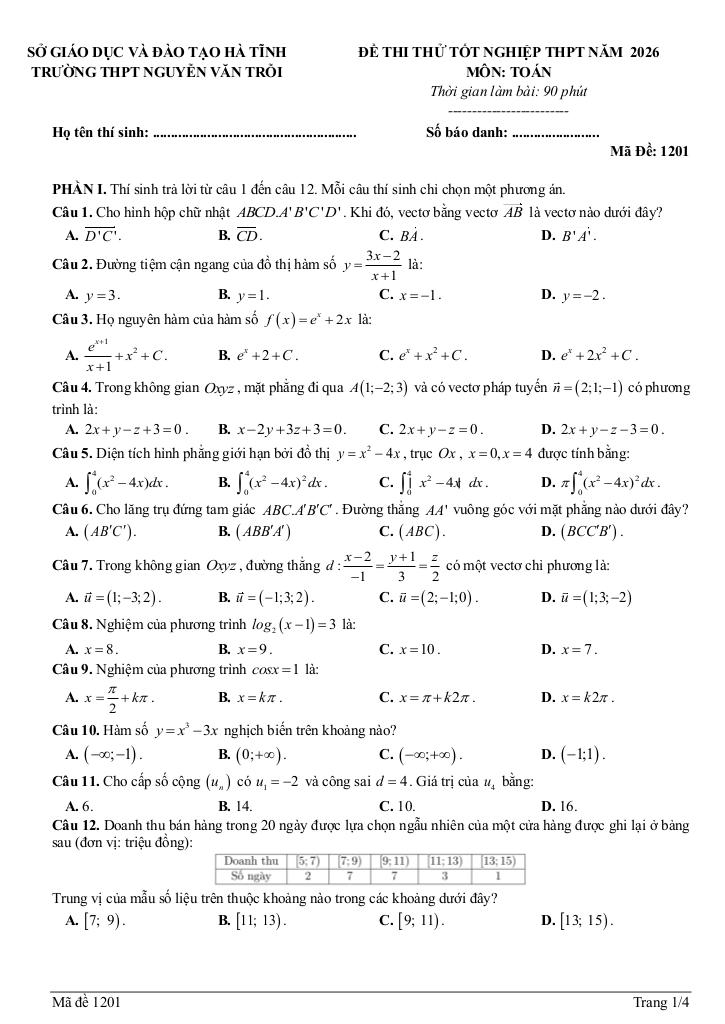 Toán học luôn là một môn học quan trọng, giúp học sinh phát triển tư duy logic và kỹ năng giải quyết vấn đề. Để hỗ trợ các bạn học sinh và giáo viên trong việc học tập và giảng dạy, bài viết này sẽ cung cấp lời giải chi tiết và đáp án chính xác cho chủ đề đề thi thử tn thpt 2026 môn toán trường thpt nguyễn văn trỗi – hà tĩnh, giúp bạn hiểu sâu và tự tin hơn khi làm bài tập.