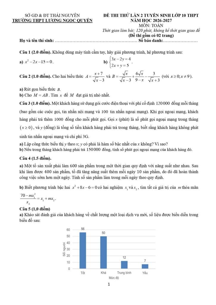 Trích dẫn Đề thi thử Toán vào lớp 10 lần 2 năm 2026 – 2027 trường Lương Ngọc Quyến – Thái Nguyên: