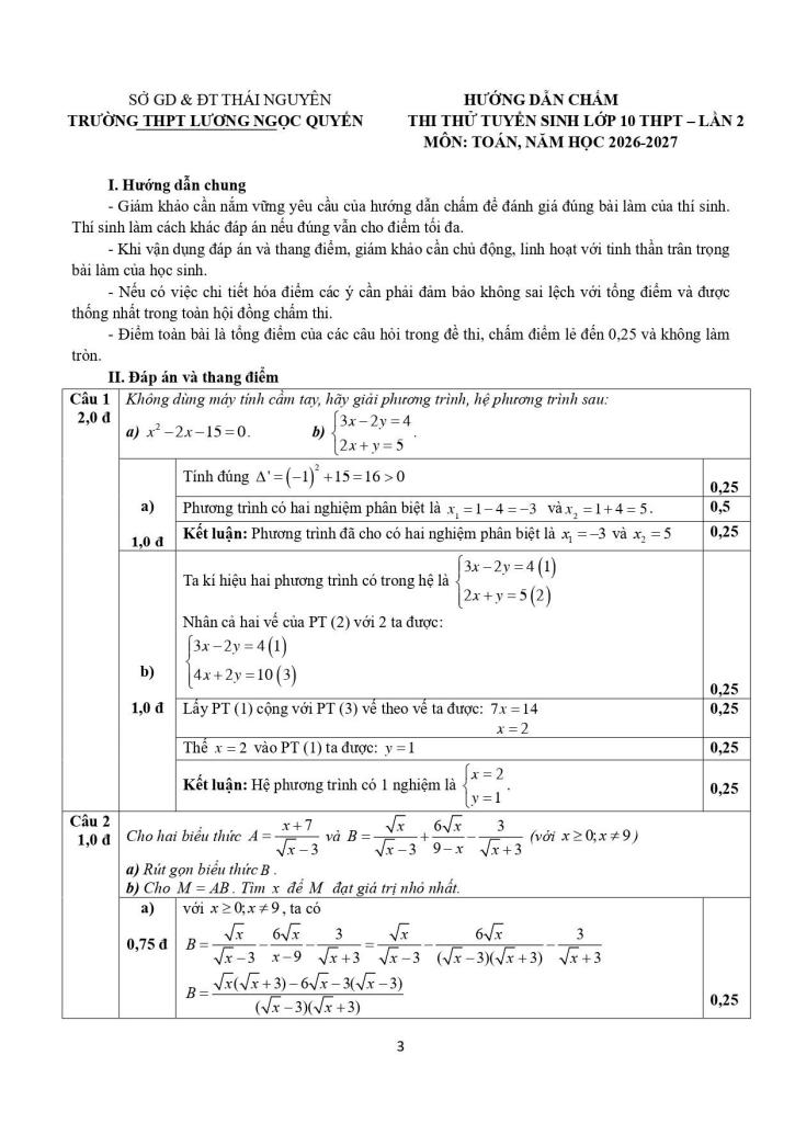 Toán học luôn là một môn học quan trọng, giúp học sinh phát triển tư duy logic và kỹ năng giải quyết vấn đề. Để hỗ trợ các bạn học sinh và giáo viên trong việc học tập và giảng dạy, bài viết này sẽ cung cấp lời giải chi tiết và đáp án chính xác cho chủ đề đề thi thử toán vào lớp 10 lần 2 năm 2026 – 2027 trường lương ngọc quyến – thái nguyên, giúp bạn hiểu sâu và tự tin hơn khi làm bài tập.