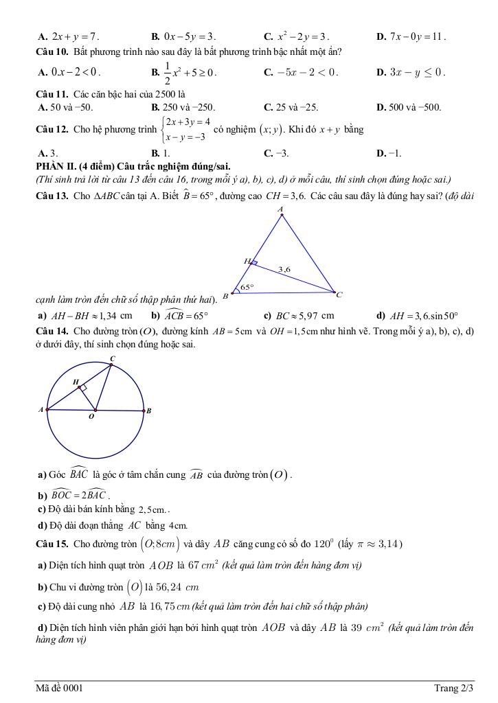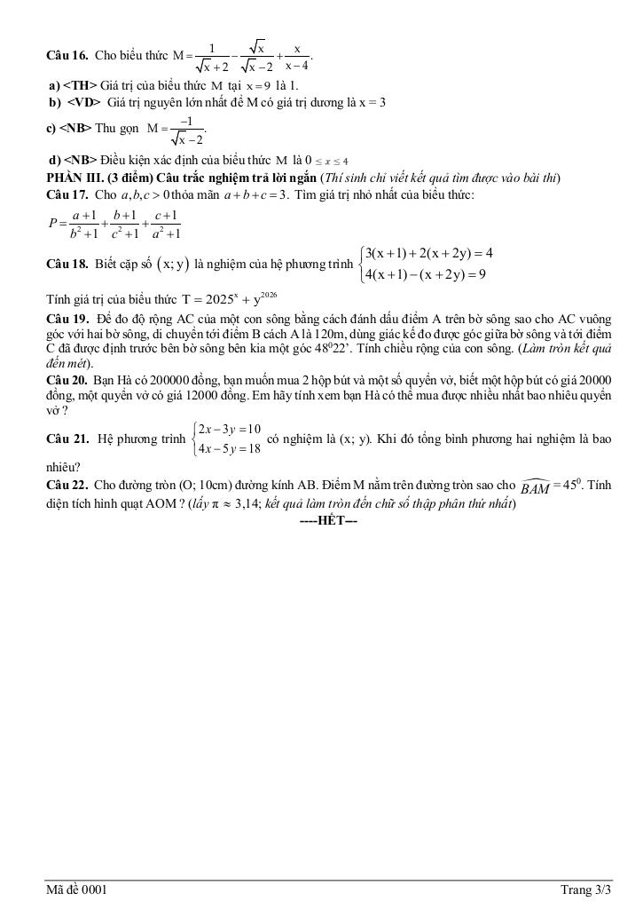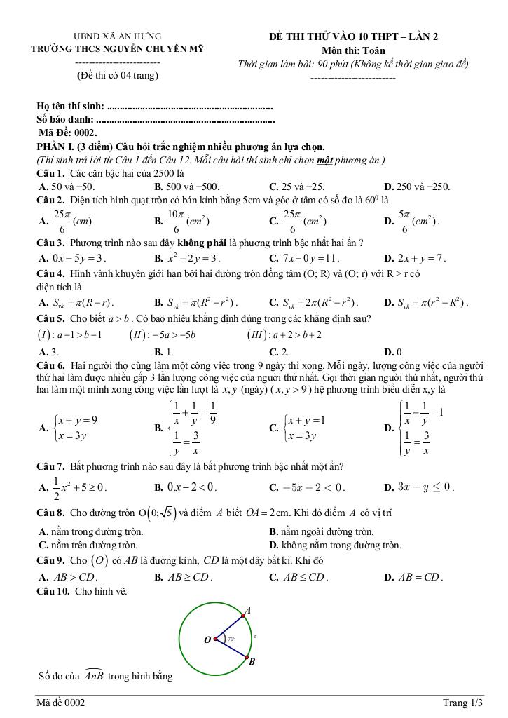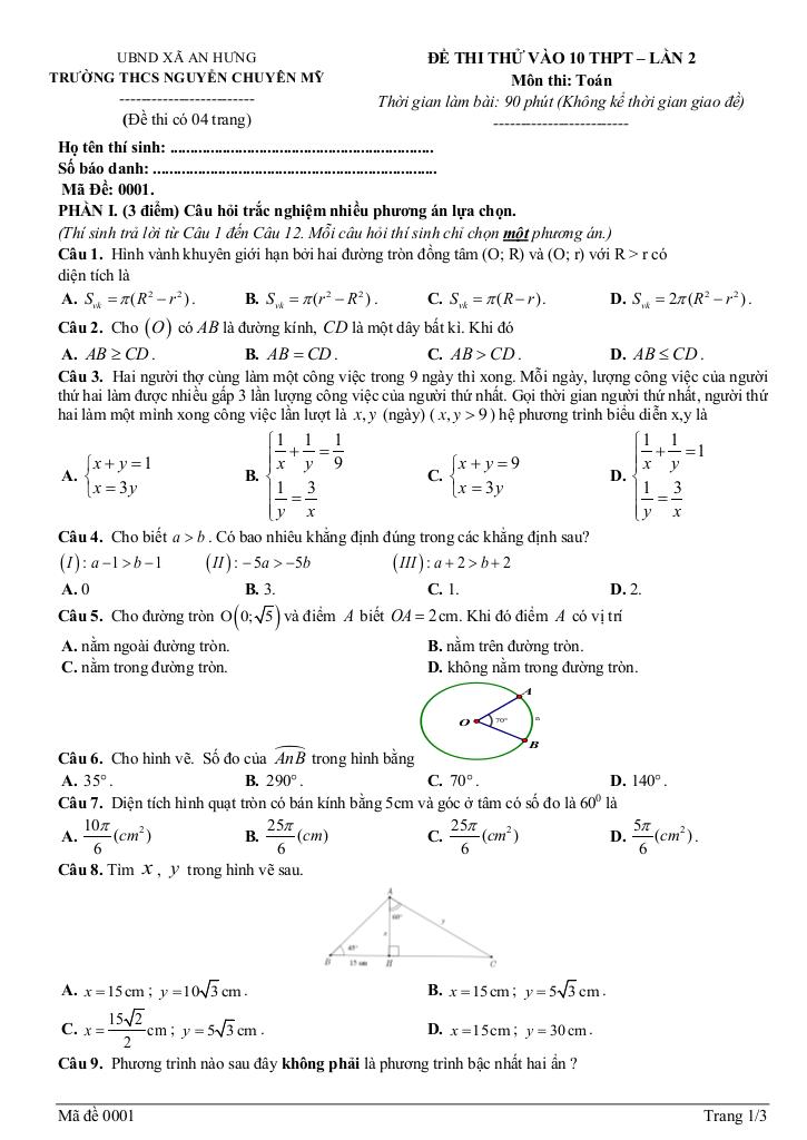 giaitoan.edu.vn giới thiệu đến quý thầy, cô giáo và các em học sinh đề thi thử môn Toán tuyển sinh vào lớp 10 THPT lần 2 năm học 2026 – 2027 trường THCS Nguyễn Chuyên Mỹ, xã An Hưng, thành phố Hải Phòng. Đề thi gồm 12 câu trắc nghiệm nhiều phương án lựa chọn (3 điểm) + 04 câu trắc nghiệm đúng sai (4 điểm) + 06 câu trắc nghiệm trả lời ngắn (3 điểm), thời gian làm bài 90 phút, có đáp án mã đề 0001 – 0002.