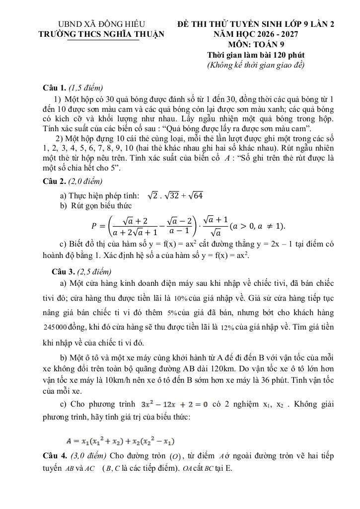 Trích dẫn Đề thi thử Toán vào lớp 10 lần 2 năm 2026 – 2027 trường THCS Nghĩa Thuận – Nghệ An: