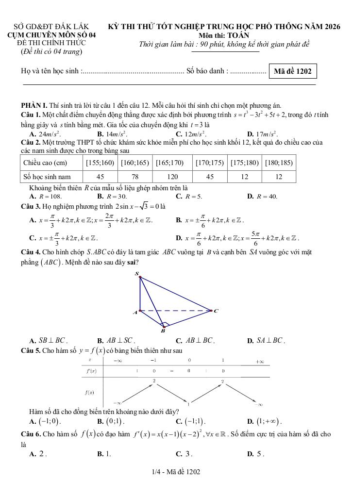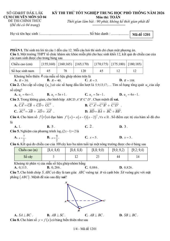 Giải Toán đề thi thử tốt nghiệp thpt 2026 môn toán cụm chuyên môn số 04 – đắk lắk với Đáp Án Mới Nhất