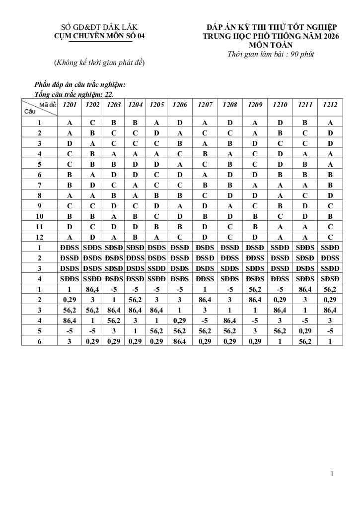 Xem thêm đáp án: đề thi thử tốt nghiệp thpt 2026 môn toán cụm chuyên môn số 04 – đắk lắk
