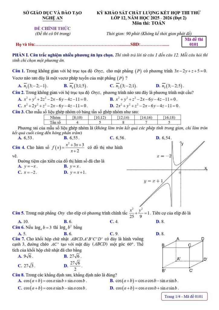 Giải Toán đề thi thử tốt nghiệp thpt 2026 môn toán đợt 2 sở gd&đt nghệ an với Đáp Án Mới Nhất
