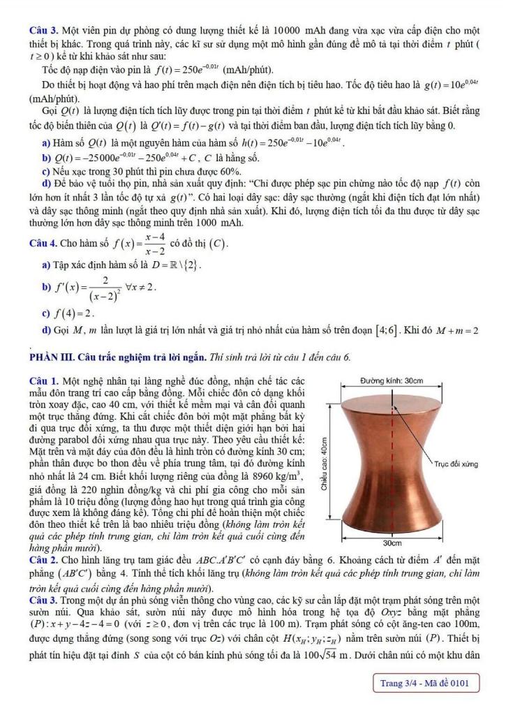 + Một nghệ nhân tại làng nghề đúc đồng, nhận chế tác các mẫu đôn trang trí cao cấp bằng đồng. Mỗi chiếc đôn có dạng khối tròn xoay đặc, cao 40 cm, với thiết kế mềm mại và cân đối quanh một trục thẳng đứng. Khi cắt chiếc đôn bởi một mặt phẳng bất kỳ đi qua trục đối xứng, ta thu được một thiết diện giới hạn bởi hai đường parabol đối xứng nhau qua trục này. Theo yêu cầu thiết kế: Mặt trên và mặt đáy của đôn đều là hình tròn có đường kính 30 cm; phần thân được bo thon đều về phía trung tâm, tại đó đường kính nhỏ nhất là 24 cm. Biết khối lượng riêng của đồng là 8960 kg/m³, giá đồng là 220 nghìn đồng/kg và chi phí gia công cho mỗi sản phẩm là 10 triệu đồng (lượng đồng hao hụt trong quá trình gia công được xem là không đáng kể). Tổng chi phí để hoàn thiện một chiếc đôn theo thiết kế trên là bao nhiêu triệu đồng (không làm tròn kết quả các phép tính trung gian, chỉ làm tròn kết quả cuối cùng đến hàng phần mười).