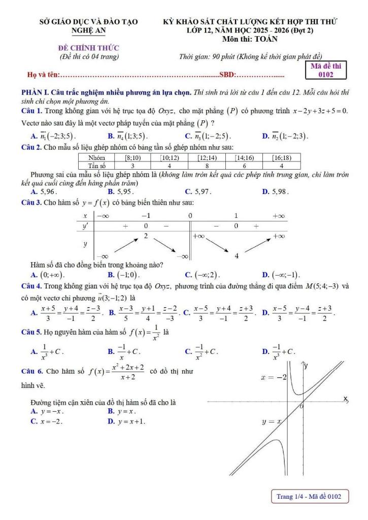 Trích dẫn Đề thi thử tốt nghiệp THPT 2026 môn Toán đợt 2 sở GD&ĐT Nghệ An: