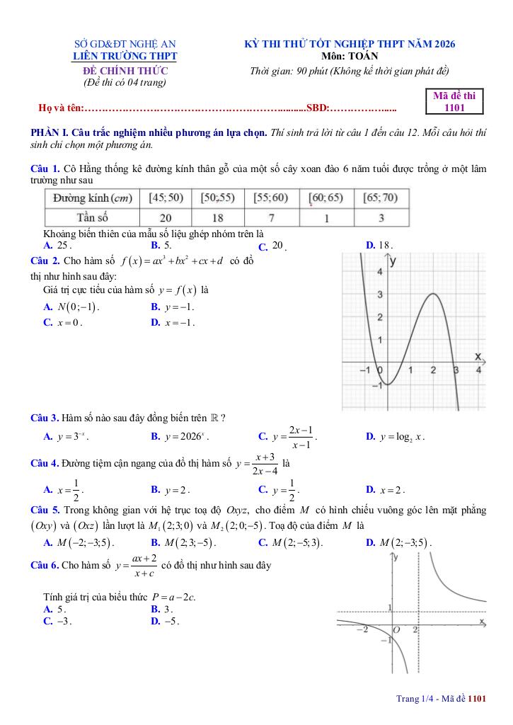Trích dẫn Đề thi thử tốt nghiệp THPT 2026 môn Toán liên trường THPT – Nghệ An: