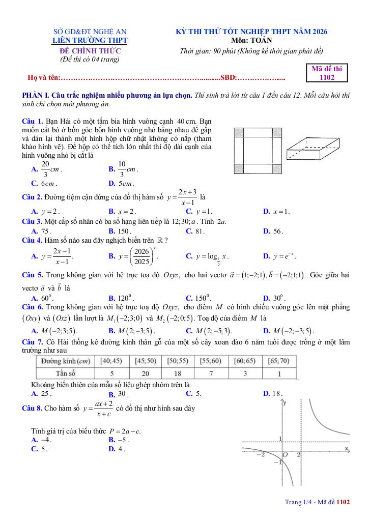 Giải Toán đề thi thử tốt nghiệp thpt 2026 môn toán liên trường thpt – nghệ an với Đáp Án Mới Nhất