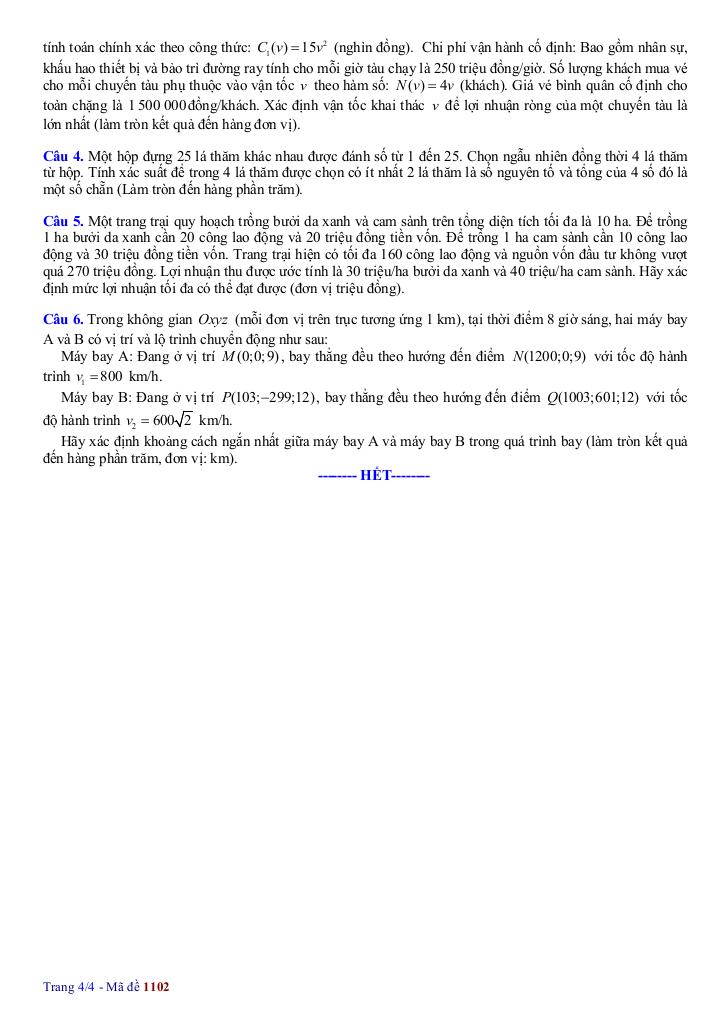 + Trong kế hoạch vận hành thử nghiệm phân đoạn dài 290 km thuộc dự án đường sắt tốc độ cao, các kỹ sư cần xác định vận tốc khai thác v (km/h) cho đoàn tàu (200 ≤ v ≤ 350) để đạt hiệu quả kinh tế cao nhất. Các thông số được xác định như sau: Công suất tiêu thụ điện của đoàn tàu là P(v) = 5v3 (W). Giá điện kinh doanh ưu đãi là 2 nghìn đồng/kWh. Chi phí vận hành cố định: Bao gồm nhân lực, bảo trì và các chi phí quản lý khác, được tính là 197780 nghìn đồng cho mỗi giờ tàu chạy. Số lượng khách mua vé phụ thuộc vào vận tốc khai thác theo hàm số: N(v) = v + 610 (hành khách). Giá vé bình quân cho phân đoạn này là 1 triệu đồng/khách. Hãy xác định vận tốc khai thác v để lợi nhuận ròng của mỗi chuyến tàu trên phân đoạn này là lớn nhất (làm tròn kết quả đến hàng đơn vị).