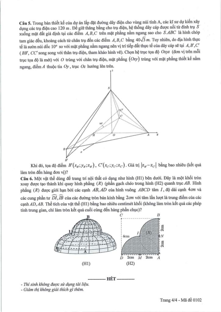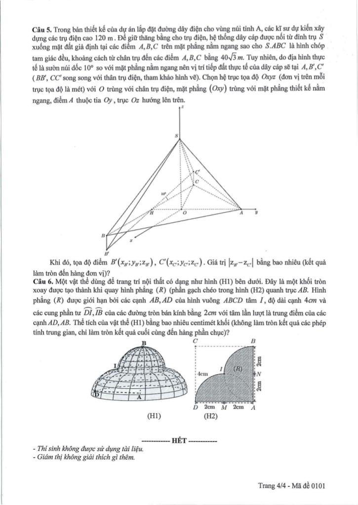 + Trong bản thiết kế của dự án lắp đặt đường dây điện cho vùng núi tỉnh A, các kĩ sư dự kiến xây dựng các trụ điện cao 120 m. Đế giữ thăng bằng cho trụ điện, hệ thống dây cáp được nối từ đỉnh trụ S xuống mặt đất giả định tại các điểm A, B, C trên mặt phẳng nằm ngang sao cho giaitoan.edu.vn là hình chóp tam giác đều, khoảng cách từ chân trụ đến các điểm A, B, C bằng 40√3 m. Tuy nhiên, do địa hình thực tế là sườn núi dốc 10° so với mặt phẳng nằm ngang nên vị trí tiếp đất thực tế của dây cáp sẽ tại A, B’, C’ (BB’, CC’ song song với thân trụ điện, tham khảo hình vẽ). Chọn hệ trục tọa độ Oxyz (đơn vị trên mỗi trục tọa độ là mét) với O trùng với chân trụ điện, mặt phẳng (Oxy) trùng với mặt phẳng thiết kế nằm ngang, điểm A thuộc tia Oy, trục Oz hướng lên trên.